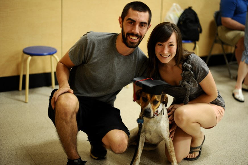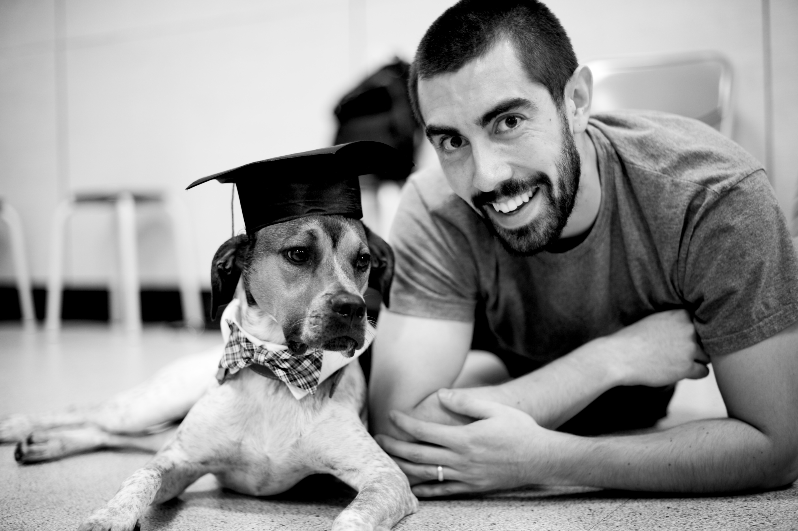 This time around, Chupete had a classmate named Scout and a family of 5 coming to work with her. Chupete had to learn to not pay attention to them and focus on us and our instructions (a huge deal for him). Also, every new command involved distractions like…the pink elephant (his kryptonite when it comes to completing any exercise correctly), squeaky toys, rawhide (irresistible) and car keys! We showed in a recent post that we have been working with him and Choripan so he could graduate with honors…and the work paid off! He was great in his final evaluation and even Choripan learned some commands! So here are some pictures of our highly educated dog and a couple of videos of his performance during his final evaluation.