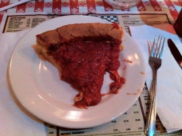 | The last big outing of the trip was a family stop at Gino’s East. My brother and Andrea rented out a party room where we had all-you-can-eat deep-dish pizza and soft drinks – SUCH a perfect way to end the trip! | La ultima actividad del viaje fue una visita familiar a Gino’s East. My hermano y Andrea arrendaron una sala donde comimos mucha pizza de plato hondo y bebidas – fue la mejor manera de terminar el viaje! |