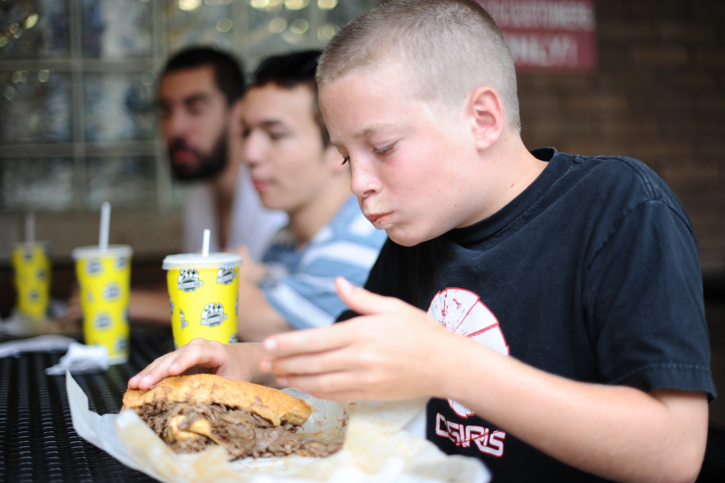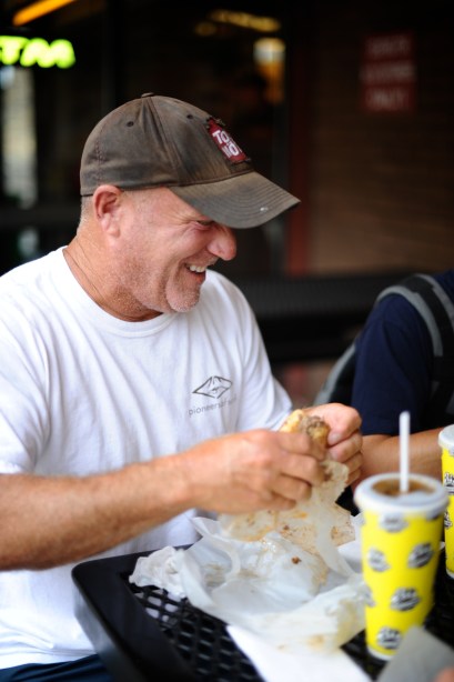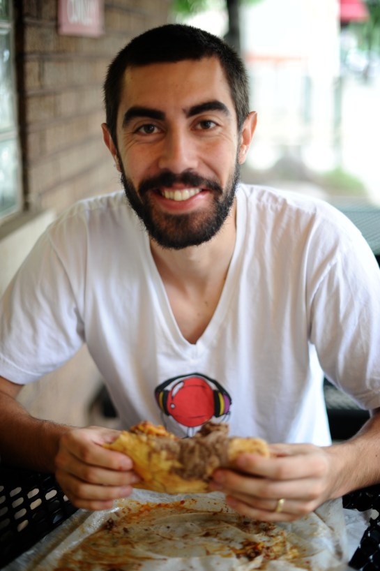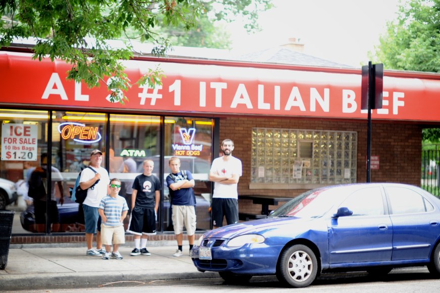 | One of our favorite shows to watch at home is Man vs. Food (but for some reason it’s always on when we are eating, which often ruins my appetite…some of the stuff he eats is just horrific). Javier has made a habit of looking up the Man vs. Food landmarks for every city we visit, so for Chicago the lucky winner for our lunch visit on Thursday afternoon was Al’s Beef for a beef sandwich. The place is an absolute dive but the sandwiches were cheap and DELICIOUS. I was lame and didn’t have mine dipped, but Javi and the rest of the folks who went with us (my cousins Matt, Steve, Andrew and uncle Warren) got a fully dipped sandwich in some beef sauce – soooo messy, but apparently sooooo good (according to the guys). | Uno de nuestros programas de television favorito es Man vs Food (Hombre vs Comida), siempre lo estan dando cuando cenamos y a veces me hace perder el apetito porque come algunas cosas asquerosas. Javier ha creado el habito de revisar los lugares que Man vs Food ha visitado, asi que para Chicago el ganador de nuestro almuerzo el Jueves fue Al’s Beef y su sandwich de carne. El lugar es pintorezco y un poco descuidado pero los sandwiches era baratos y DELICIOSOS. Yo fui fome y no deje que sumergieran el mio, pero Javier y el resto de la familia que fue con nosotros (mis primos Matt, Steve, Andrew y mi tio Warren) lo pidieron sumergido and un caldo de carne – muy desordenado pero aparentemente muuuuuuy rico (de acuerdo a los chicos) |