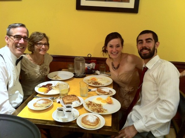 After dinner and toasts (Andrea had a maid and matron of honor, her sisters, and Ian had 2 best men) Andrea and her dad danced the jitterbug for the father/daughter dance (SO cute!!!!) and then dad played guitar while I sang Godspeed for Ian and mom. That’ll go down as one of my favorite moments in my life. Then it was party time…and I’ve never attended such an awesome party! One of my brother’s groomsmen is a DJ in LA and he flew out one of his friends he DJs with to play music all night which was perfect because he knew what Ian, Andrea and all their friends love to hear. There was a photobooth in an outside room and mini desserts, cupcakes and late night snacks (onion rings and burgers!) for anyone in need of some solid sustenance. The bars were open and flowing all night and Javi and I had a special stash of Firefly Sweet Tea vodka (thanks aunt Shelley and uncle Warren!) so basically everything was just right. I got about 1,500 photos of the reception (whaaaaat!) and don’t remember taking the last 300 of them. The hotel bar was open til 1AM so we kept the party going there until 1:30 when Javi and I took a taxi with my parents to Eggsperience, which is where we pick up from the last post.