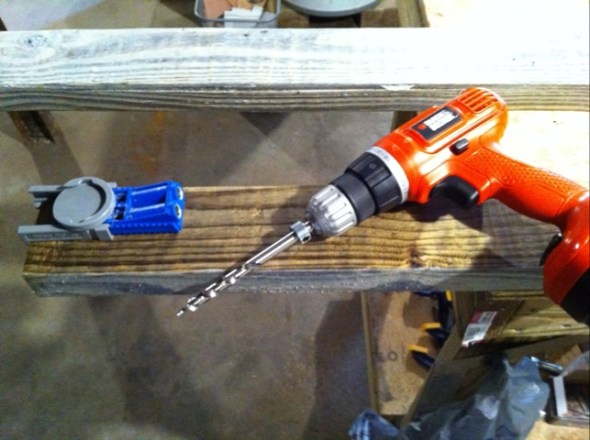I used a Kreg Jig for some of the joints. This little tool makes a perfect hole in the wood that allows you to screw diagonally on a perfect angle, ensuring a strong joint. Really cool and easy to use.