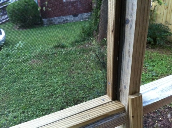 To attach the actual screen I used 1 x 2 x 8s and made frames to fit each section and screw them into the treated lumber. Then we stapled the screen and cut a 2nd set of frames to cover the staples and screw to the lumber. Like a fiberglass sandwich on treated lumber buns…that sounds not tasty at all! You need at least two people to set the screen tight, so Leslie was perfect (Chupete and Choripan wanted to help but their attention span was not adequate for the task)