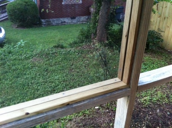 The plan was to screen wall by wall starting from the side panel to the front and then the panel with the door. Why do it that way? well we figured that we would use the practice from wall to wall so once we got to the most difficult one, the door, we’d be experts! So after I planned, figured out the wood and measured a lot we started my project. I decided to use treated lumber as a way to extend the life of the screening job, and I chose fiberglass screen instead of aluminum – aluminum is more resistant but it also rusts and has sharp edges, so we will just be really careful and go for the safer material. I also decided to use 2 x 4 x 8s for the bottom piece, the middle stud and the middle horizontal piece. For the sides and top we used 1 x 4 x 8s. That would be the overall frame.