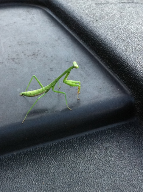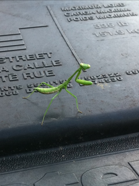 As I mentioned in the past post we have a lot of bugs too, but most of them just the typical ones (mosquitoes, flies, spiders, crickets, beetles, butterflies, wasps, etc…) Choripan loves to eat crickets…his favorite hobby when I let him in the basement. But today when I was hauling our trash can I found the coolest bug so far….a praying mantis! It scared the crap out of me but when I realized what it was but I was so excited to see it. It wasn’t big but it was so cool, a classy looking bug. So I took a few pictures while the thing was doing its evening yoga and praying. So here is our new friend…I hope the dogs don’t get him…