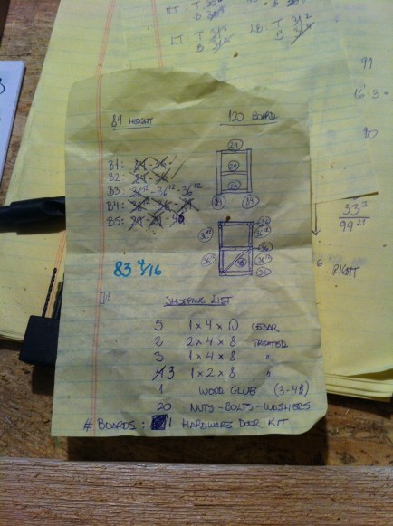 Como no use un kit con los marcos hechos e hize todo yo, no queria comprar una puerta de mala calidad en la tienda. Queria mostrar mi talento en carpinteria y tambien adquirir un dolor de cabeza construyendo una puerta con los angulos perfectos e instalandola correctamente. Asi que aqui va la historia de como termine el porch instalando mi propia puerta! Despues de unos dibujos, un buen rato pensando, e investigando materiales construi mi puerta.