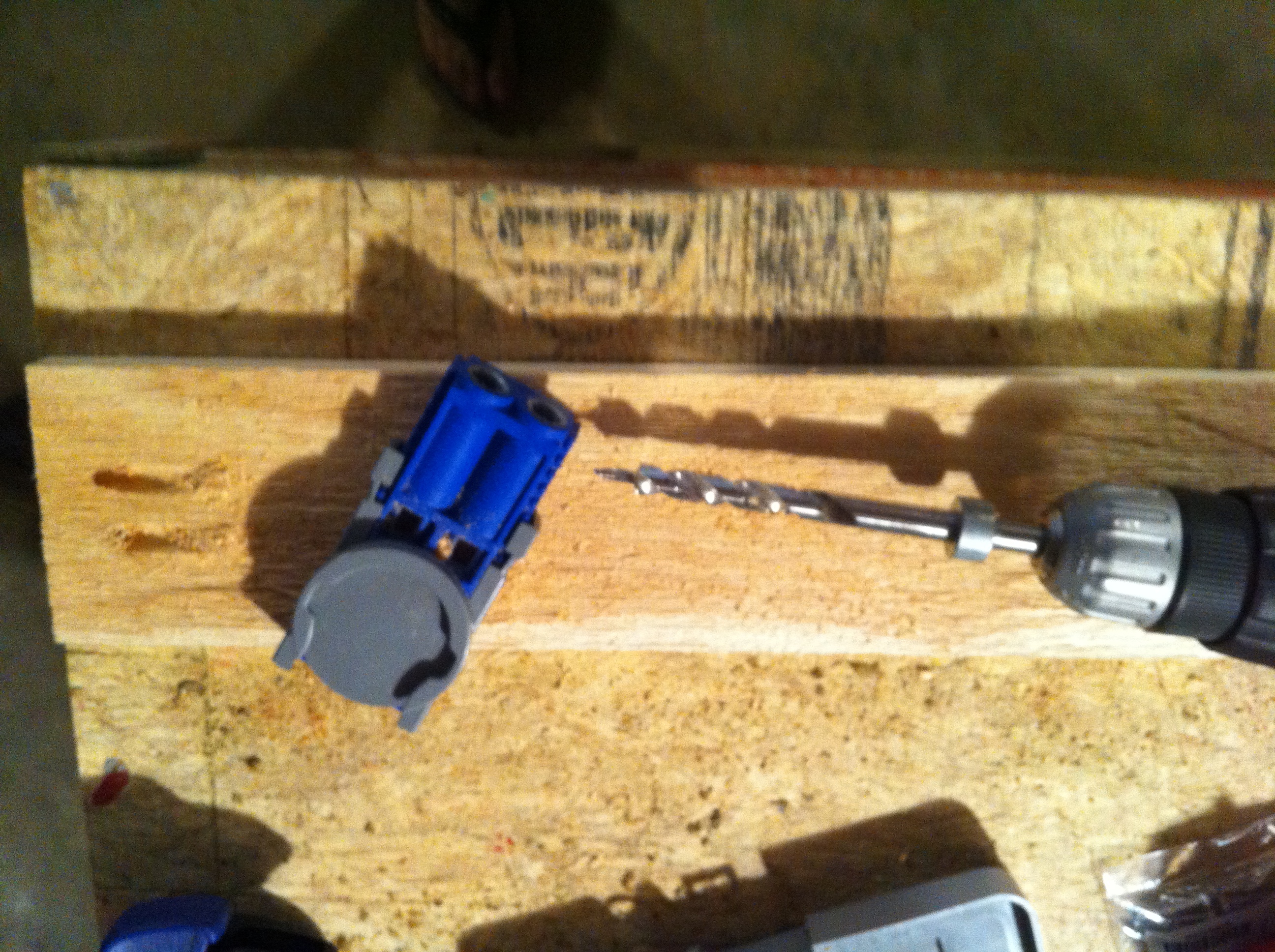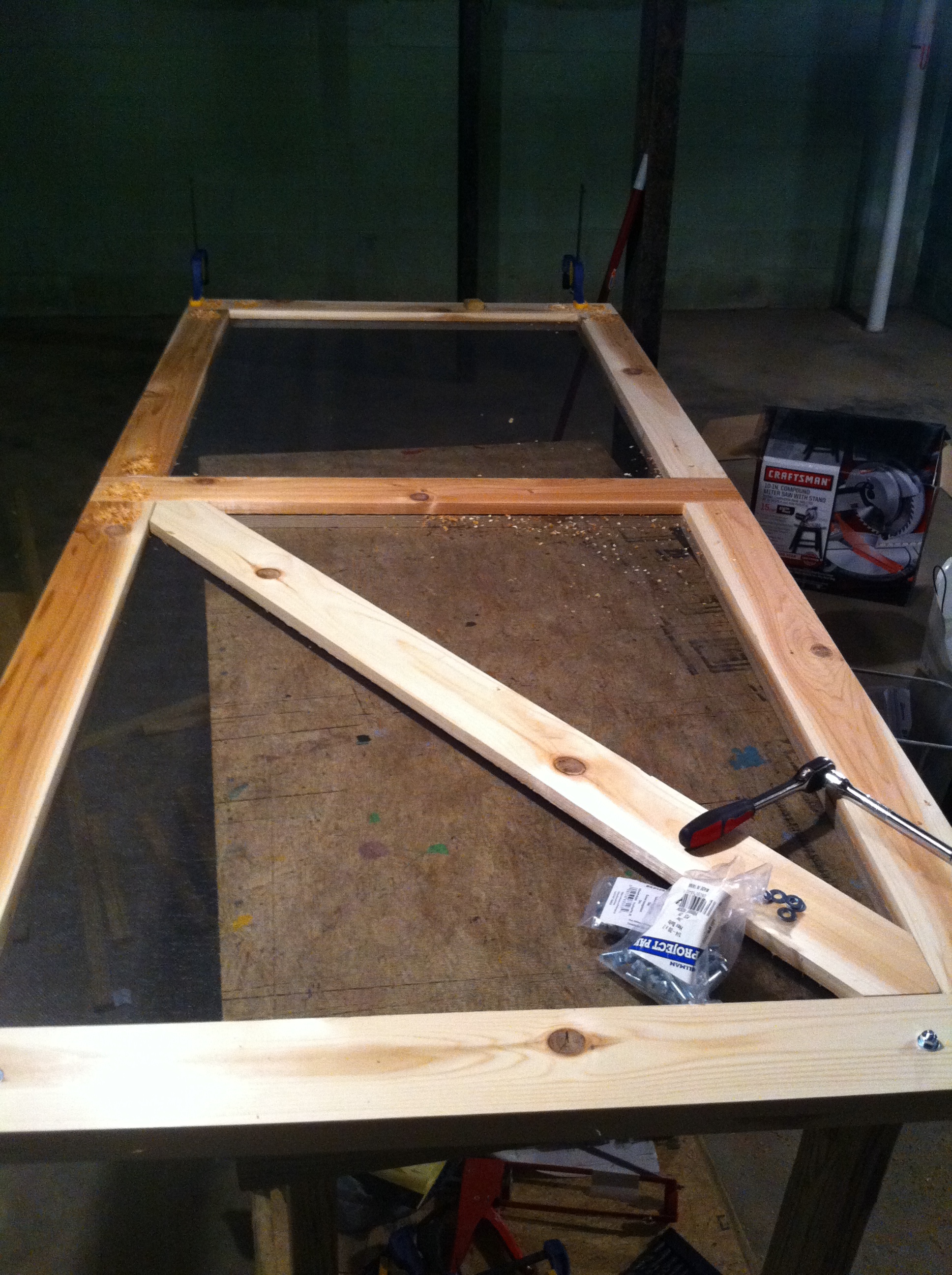 Los marcos no son identicos; los hice para que las uniones se sobrepusieran y asi la puerta sea mas firme – puedes tener una idea de mi diseno en mi dibujo, un marco tiene 5 piezas y el otro tiene 8. Para hacer las uniones, use una herramienta llamada Kreg Jig (muy util!) y para hacer los cortes use una sierra que me permite cortar angulos. La Kreg Jig te salva mucho tiempo porque no necesitas usar pegamento en las uniones y como usa tornillos queda muy muy firme.