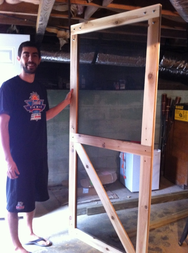 Luego de construir el marco que iria al exterior, installe la malla y uni los marcos con los pernos. Me puso contento encontrar todo lo que necesitaba para colgar la puerta en la tienda. Manillas, visagras que se cierran solas y un ganchito para sujetar por $12 dolares. Muy buena compra!