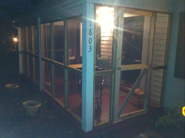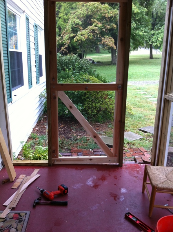 Instalar la puerta fue super dificil. En un principio pense que la habia embarrado construyendo la puerta y que no me habia quedado recta. Pero luego me di cuenta que el problema era el porch…un lado no estaba nivelado y eso hacia la puerta verse extrana. Pero luego de tomar las medidas necesarias y cortar 1/4 de pulgada de la parte de arriba de la puerta, pude instalarla correctamente y funciona a la perfeccion. Una pieza de madera al tope y a los lados y listo. El porch esta listo para que lo usemos nosotros y no los bichos!!! Fue entretenido trabajar en este projecto y le agrega valor a la casa. A Leslie y los cachorros les encanta….asi que pronto ella escribira un post sobre como usamos el nuevo espacio, asi que esten atentos!