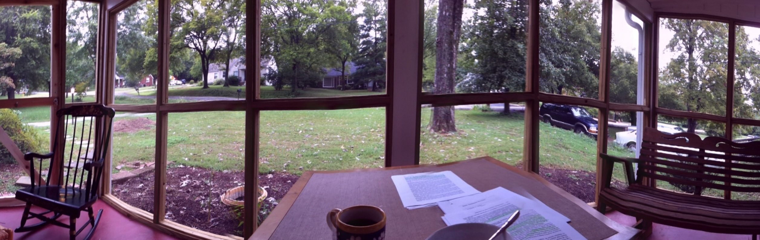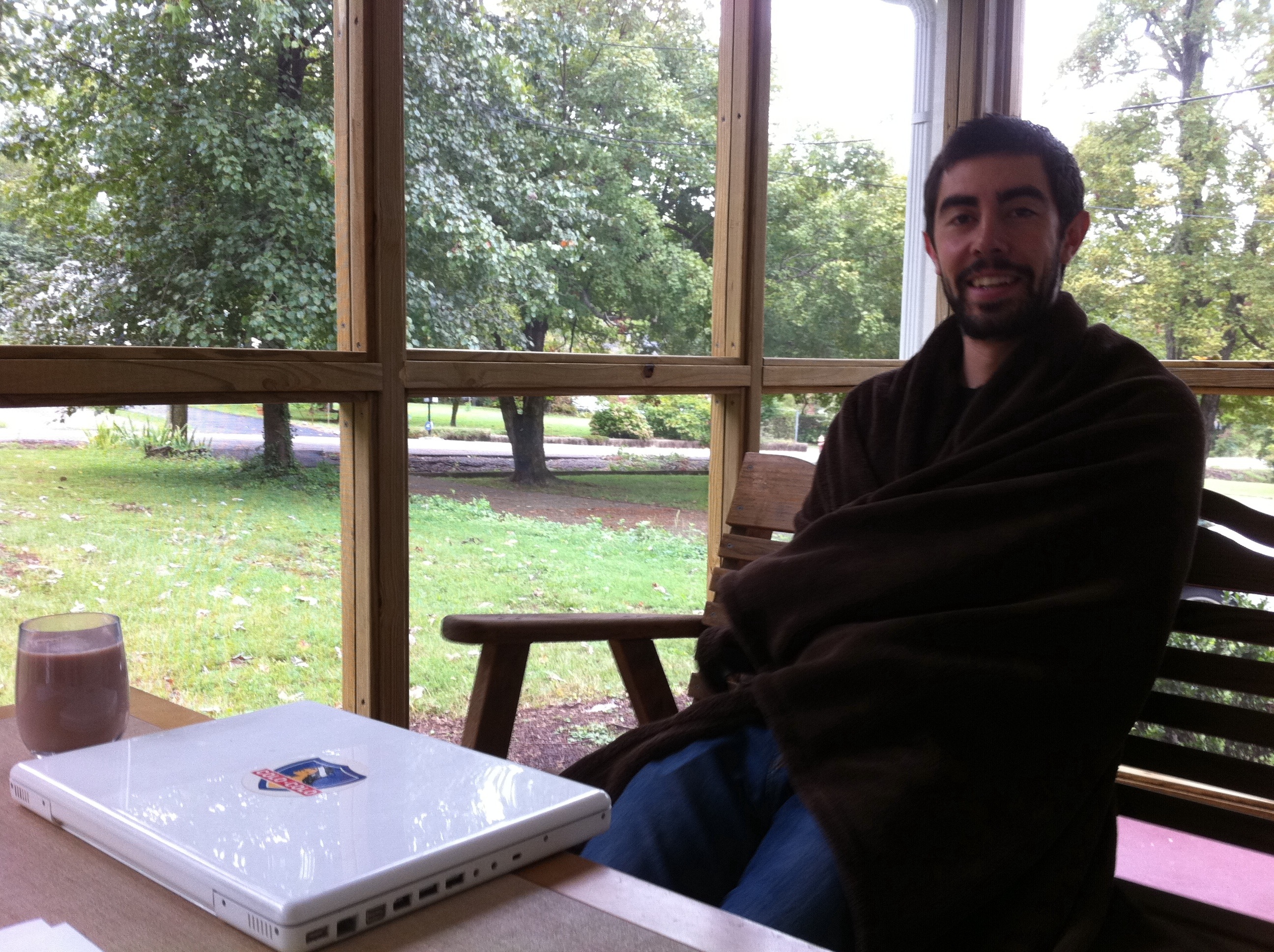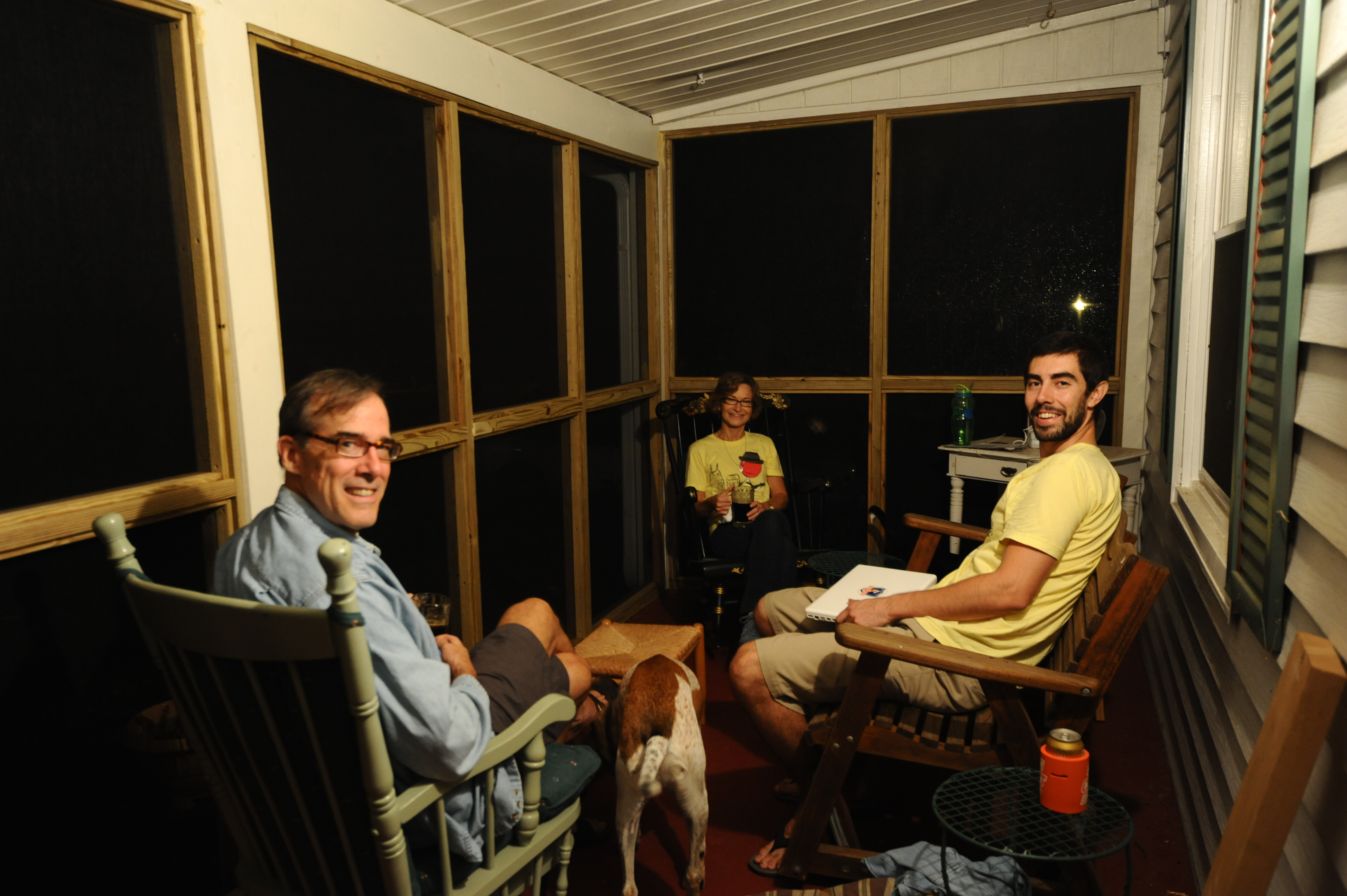 As I mentioned in my post about our los Rodriguez Sunday, we spent our first evening on the porch with my parents having a few beers and enjoying the cooler air. Javi hadn’t quite finished with the far end of the porch, but on Monday he was able to screen in the last couple of panels so now it’s just a matter of painting the whole thing to really make it 100% perfect. Still, I’m so happy it’s all set up that I’ve spent most of my time at home on the porch since Sunday. I have a really nice little wood card table that Javier and I inherited from my great grandmother that I’ve been using as a desk for homework on the porch and my productivity rate has soared. I can’t really account for the reasons why sitting outside makes me more productive than inside…I mean I still have internet access out on the porch, but I guess being outside is just a better environment for me.