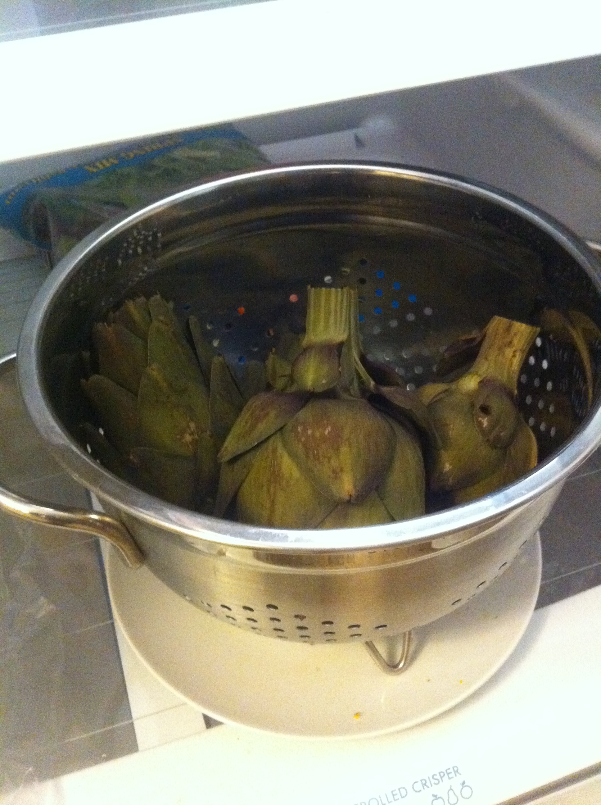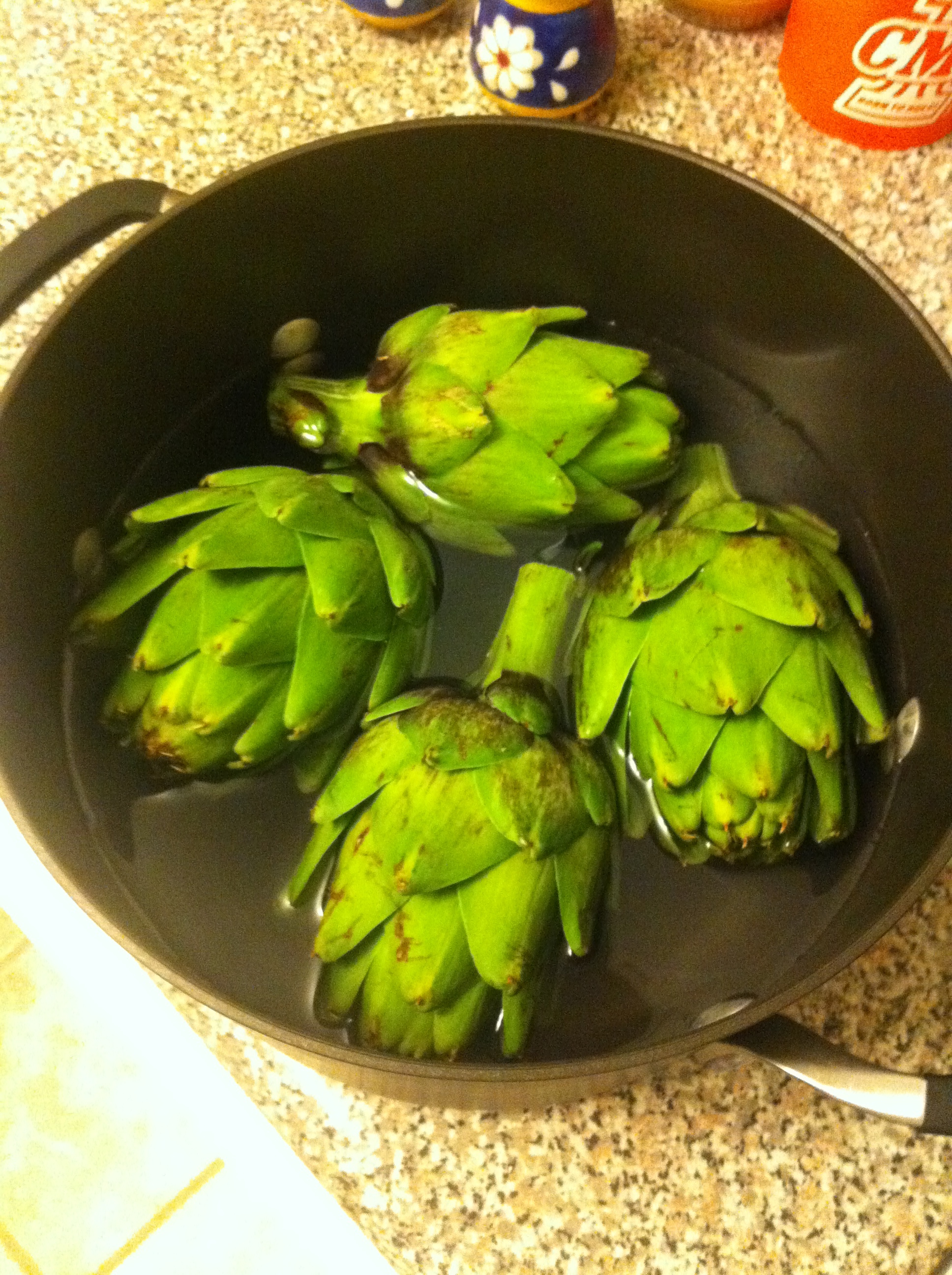 Una de mis comidas favoritas son alcachofas. Aqui en los Estados Unidos parecen ser una comida reservada para eventos especiales, muy gourmet, pero yo creci comiendo alcachofas en Chile (mi mama sabia que me encantaban y como siempre he sido flaco me daba muchas! jajaajja). He visto varios lugares vendiendo alcachofas pero nunca intente prepararlas…hasta la semana pasada! De vez en cuando es rico preprar algo que te recuerde tu casa.