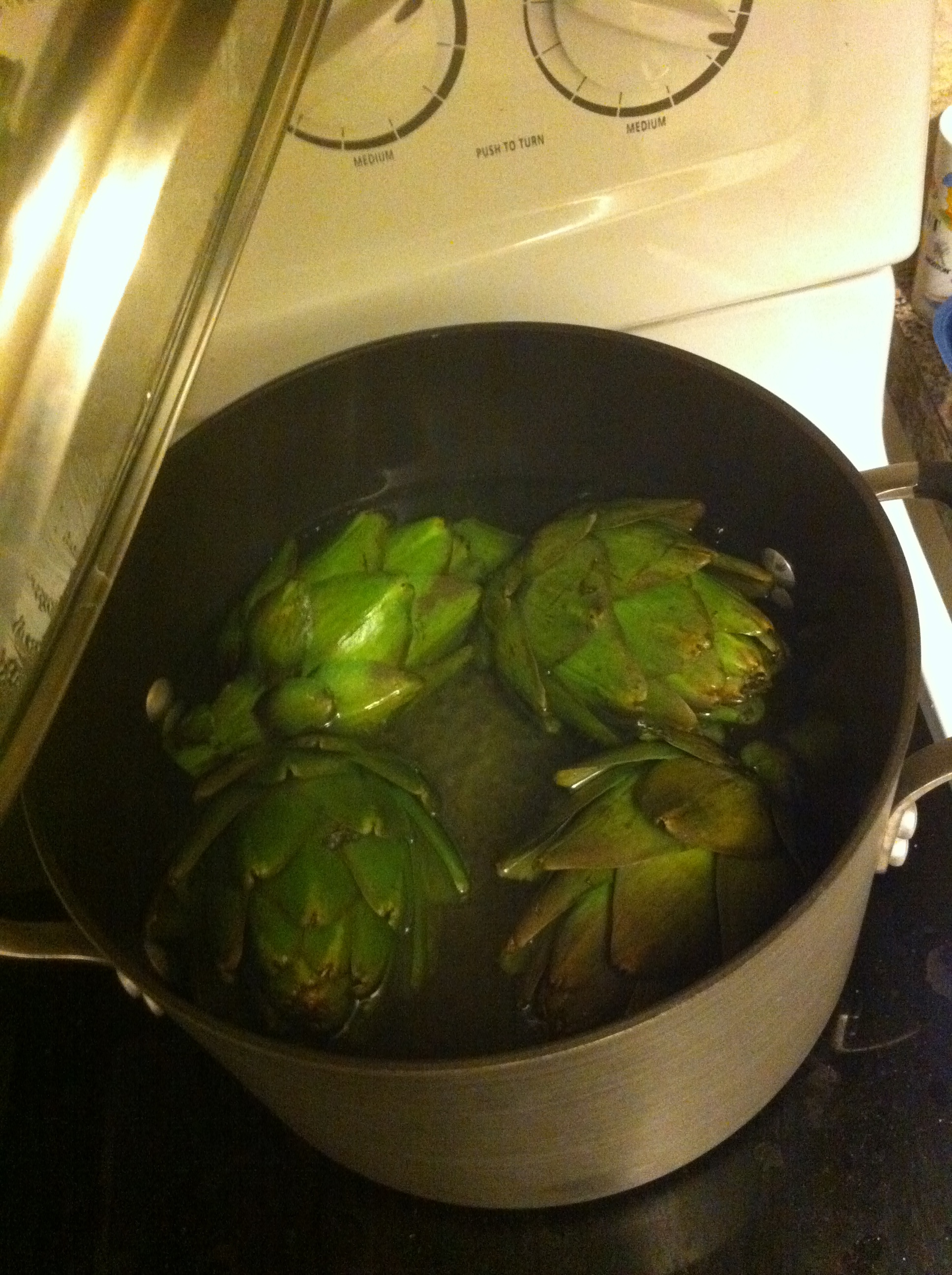 3. Put all the artichokes in a big pot and add water – you want them to float in the pot – cover the pot and start boiling them.