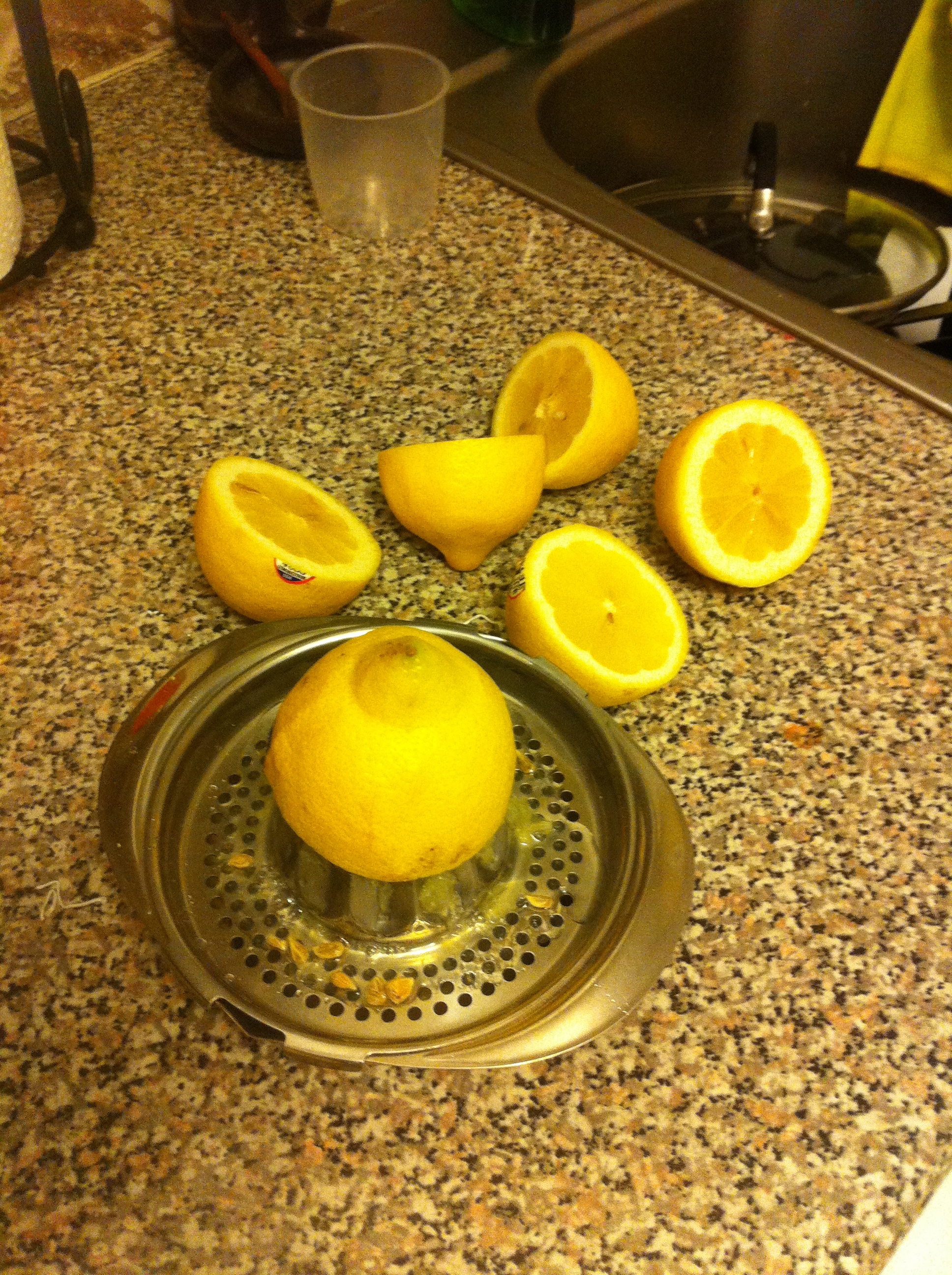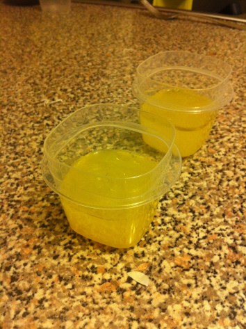 You need to make a seasoning with lemon juice, olive oil, and salt. I used about 4 lemons, two teaspoons of olive oil and a little bit of salt – there is no right or wrong it’s all up to you – just make sure you have more lemon juice than oil and shake it all well. I divided mine into two servings and put them in little containers.