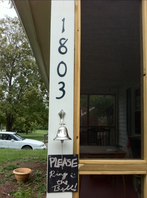 Javi and I realized last weekend that our screened in porch, which is locked most of the time, makes it kind of hard for folks to knock on our door to let us know they are standing outside. We never had a doorbell in the first place, even on our front door, so we decided to install our own los rodriguez version of a doorbell on the outside of the screen door. It’s definitely loud enough so that we can hear it anywhere in the house / out back when someone is here! Javi bought the bell off of e-bay and we installed one of our little home-made chalk boards right under it with pretty clear instructions…just in case.