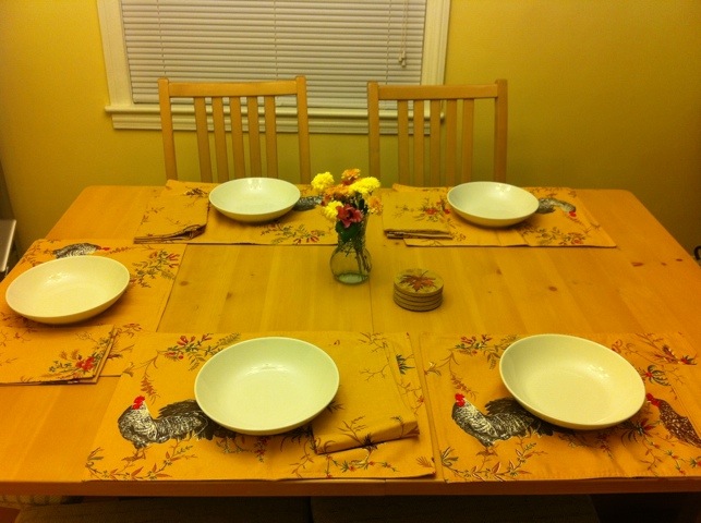 My dad grew up on a farm where the vegetables, including bell peppers, were fresh and homegrown. His mom made stuffed peppers for him all the time, so after a couple weeks of pestering my mother to make them, my dad finally got to indulge in his childhood favorite. My parents brought the dinner to us, which is especially nice for us because 1) we don’t have to go anywhere 2) we don’t have to go anywhere with the dogs 3) we finally get to use our wedding gifts we got 2 years ago that are for entertaining guests! So we got to bust out our fall-themed place mats and napkins and they looked just as good as I always hoped they would. Now if I can just find an occasion to break out our acorn bowls…