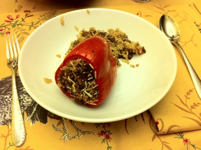Mis papas y abuela vinieron el Domingo a cenar y mi mama preparo el plato fovrito de mi papa – pimientos rojos rellenos!! Cuando era nina yo era estupidamente manoza para comer incluso hasta mi segundo ano de universidad, asi que me perdi algunas de las mejores comidas en el mundo, incluyendo los pimientos rellenos. Mi mama probablemente nunca penso en preparar algo asi durante mi ninez porque lo iba a esparcir en el plato para que pareciera que comi algo cuando la verdad no puse una cucharada en mi boca. Pero luego vivi en Santiago de Compostela con una familia espanola por 6 meses, durante mi segundo ano de universidad, y basicamente tenia que comer lo que mi “mama” me preparaba , lo cual (sorprendentemente!) era realmente delicioso! Asi que me tomo hasta que vivi en el extranjero para por fin empezar a disfrutar de los vegetales y otros sabores (estudiar afuera SI sirve!)