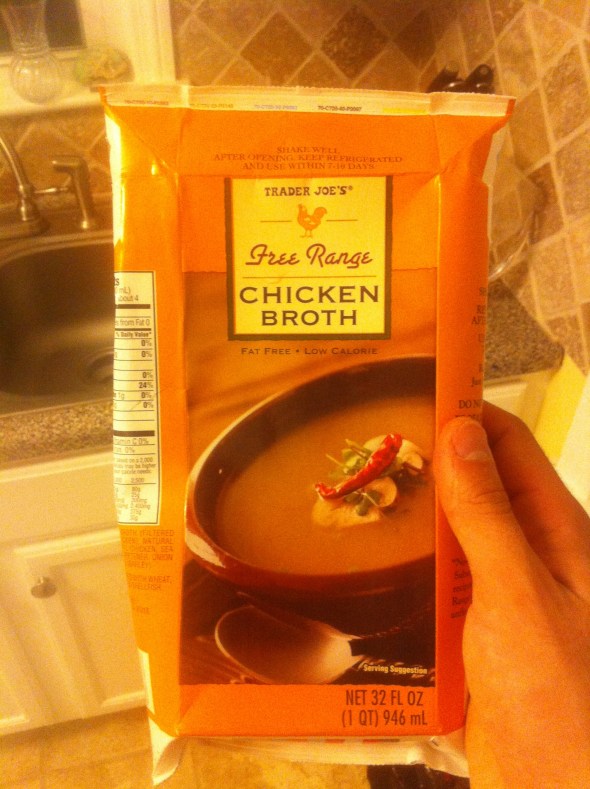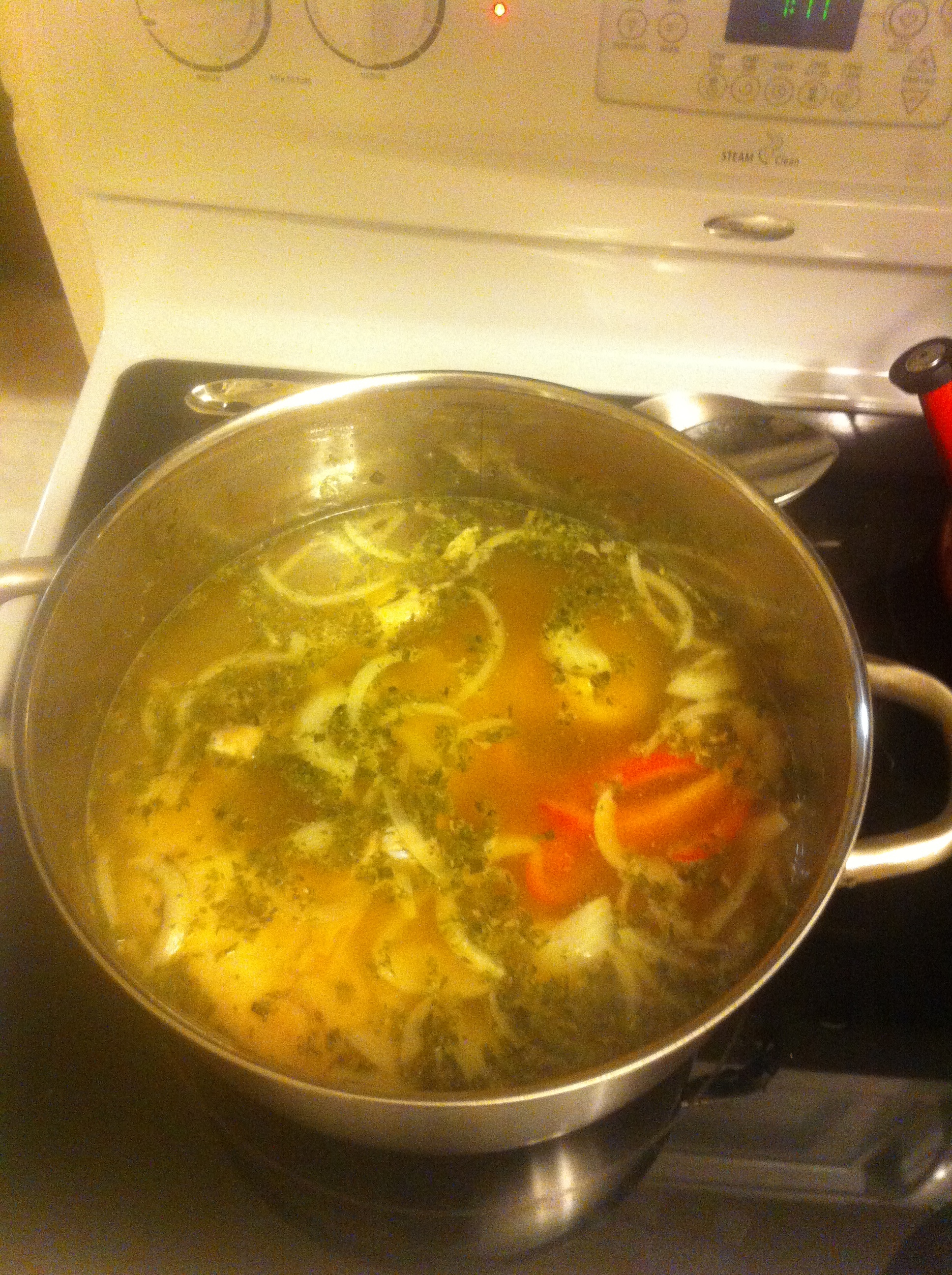 Basicamente necesitan un par de pedazos de carne – la cantidad de pedazos es la misma cantidad de platos que vas a servir (nosotros usamos piernas de pollo de nuestra granja – Emerald Glen – si usan carne de vacuno obviamente no es sopa de pollo, pero Javi dice que se peude hacer con costillas y otros cortes), el mismo numero de papas como numero de platos, 1 pimiento rojo, media cebolla, 1/4 de taza de arroz y suficiente agua o caldo de pollo para tapar todo en la olla. Agregen sal al final para estar seguros que no esta muy salado.