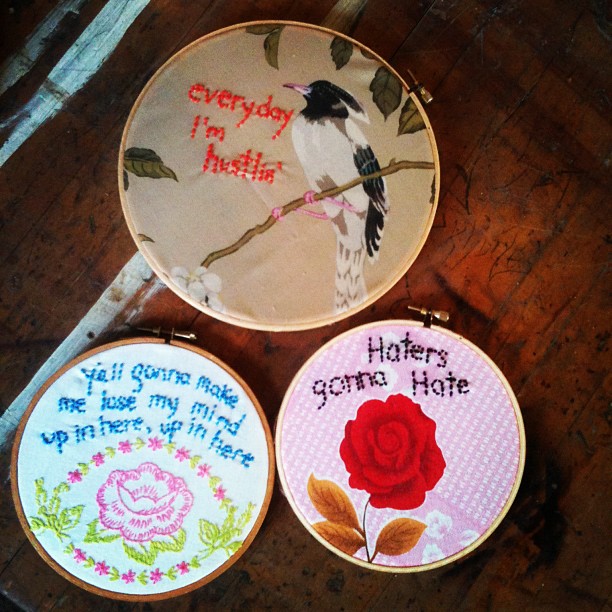 | That brings me to an important point – everything in the store is one-of-a-kind, so if you decide you like something, you better get it before someone else does. A week ago they posted a few needlepoints that one of the ladies in the shop made and the caption of the photo said “not your grandma’s needlepoint” – and right away I knew I had to have the top one (pictured below). I immediately wrote them a message on facebook and asked them to post it online so I could purchase it – I would have been so sad if someone scooped it up before I could! Good news for these particular items, in case anyone wants one – if they sell out of their “Naughty Needlepoints,” you can order them custom (at least with the phrase you want, I’m guessing) from the shop. The owners make jewelry, spruce up items like clutches (see the one I bought below – they added the cute decor on the top) and refinish furniture in a way that makes you look at it and say “dammit why didn’t I think of that?!” – but that’s the genius of this shop – they do the thinking / creative work for you, and you get to enjoy it when you bring it home. I love to refinish furniture, but I rarely have the time for it now like I did when I was in college moving into my first off-campus house and refinishing all of the dressers I grew up with. They find in-cre-di-ble pieces of furniture and make them 100x more amazing than you ever imagined they could look (a case in point). It’s the same with the clothes – if you have time to go to yard sales, flea markets and thrift shops to look for hours and find the gems, that’s great…but OMG makes it their job to find the items that you dream about and keeps them all in one place for you. | Eso me lleva a un punto importante – todo en la tienda es unico, asi que si te gusta algo, mejor que lo compres antes que alguien te lo gane. Una semana atras postearon unos bordados que una de las senoritas en la tienda hizo, con la nota que decia “no el tipico bordado de tu abuela” – y de inmediato supe que tenia que comprar el de arriba. Las mande un mensaje en Facebook rapidamente y les pedi que lo pusieran en la tienda virtual para poder compralo – hubiese sido triste si alguien lo compraba antes que yo! Buenas noticias para estos objetos, en caso que alguien quiera uno – si se agotan , puedes pedir que hagan uno (con la frase que quieras) en la tienda. Las duenas hacen joyas, decoran cosas como carteras o billeteras (vean la foto abajo – ellas agregaron la decoracion encima) y tambien adornan muebles de formas que te hacen pensar “rayos! porque yo no pense en eso!?. Pero eso es lo genial de esta tienda, tienen mucha creatividad y hacen un muy buen trabajo para que tu tengas estas cosas y las puedas disfrutar en casa. Me encanta decorar muebles, pero raramente tengo tiempo para hacerlo como lo hice cuando estaba en la universidad y me mude a mi primera casa fuera del campus y decore todos los muebles de mi pieza de cuando era nina. Ellas encuentran muebles geniales y los hacen 100 veces mejor de lo que te pudieras inmaginar (aqui un ejemplo). Es lo mismo con ropa – si tienes tiempo de ir a ventas de garage, feria de las pulgas y tiendas de segunda mano por horas para encontar estas gemas, bien…pero OMG hace todo el trabajo por ti y junta todo en un solo lugar. |