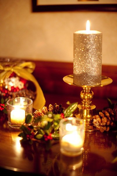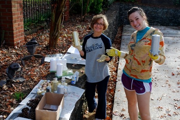 | Maybe it’s a self-fulfilling prophecy: I think Christmas decor will make me happier so I make myself feel happy when I look at the Christmas tree next to my desk, especially during moments like the one I had a few days ago when I realized I still have about 15,000 words at least to write over the next two weeks before it’s all over. Whatever it is, it works pretty well and I’m not going to question it. Also, this is the first year of decorating my very own house, and the first year since our wedding I’ve been able to use the decorations we made for the reception!! We made a TON of different decorations, but the best were the glittery pine cones and candles. We made a couple hundred different sized sparkly candles to save money – buying pre-sparkled candles wasn’t an option ($10 per candle?!). My mom and I used Martha Stewart glitter and spray glue on boxes and boxes of candles and it turned out that we only used about half of them, so we have boxes and boxes of sparkly candles in the attic now. I brought about 20 back to my house – the glass that they are sitting in are glass dishes and bowls we bought from goodwill over the course of 4 months before the wedding. I’m so glad I kept them (and my mom kept my dad from throwing them away) – they look awesome!!! Below are a few photos of me and mom making them before the wedding. | Tal vez es una profecia: creo que las decoraciones de navidad me haran mas feliz asi que me hago mas feliz yo misma mirando al arbolito de navidad al lado de mi escritorio. especialmente en momentos como el que tuve un par de dias atras cuando me di cuenta que todavia me faltan por escribir mas o menos 15,000 palabras en las proximas 2 semanas antes que todo acabe. Sea lo que sea, funciona muy bien y no voy a questionarlo. Tambien, este es el primer ano decorando mi propia casa, y el primer ano que he podido usar las decoraciones que hicimos para nuestro matrimonio! Hicimos una tonelada de distintas decoraciones, pero las mejores fueron las pinas de pino con brillantinas y las velas. Hicimos un par de cientos de velas de distintos tamanos para ahorrar plata – comprar la velas con brillantinas ya puestas no era una buena opcion ($10 por vela??). Mi mama y yo usamos brillantina Martha Stewart y pegamento en spray para cajas y cajas de velas y al final solo usamos la mitad. Asi que tenemos cajas y cajas de velas con brillantina en el atico. Traje como 20 a mi casa – todas las cosas de vidrio que usamos para poner las velas las compramos de segunda mano en Goodwill durante un periodo de 4 meses. Menos mal que mi mama evito que mi papa las tirara a la basura despues del matrimonio. Estoy muy feliz que nos hayamos quedado con las decoraciones! Aqui van algunas fotos de mi mama y yo haciendo manualidades antes de la boda. |