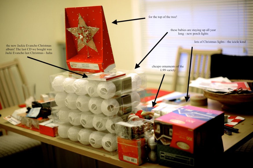 My mom excavated another box of our Christmas decor from her attic for us, so we had more decorating to do. We had a few strands of lights but not nearly enough to accomplish what Javi had in mind for our porch and the front of our house and I needed a few more odds and ends to cap off the decorating frenzy, so we took a trip to Lowe’s to get the rest of what we needed. We didn’t own ANY extension chords prior to this trip, which has been a major pain for the last few months, so we finally remedied that problem and bought a few other tools to make decorating easier. Mi mama encontro otra caja de decoraciones navidenas en el atico el fin de semana pasado, asi que teniamos mas material. Teniamos un par de hileras de luces pero no lo suficiente para lograr lo que Javi tenia en mente para el porch y el frente de la casa y yo necesitaba un par de cositas mas para terminar de decorar, asi que hicimos un viaje a Lowe’s para agarrar lo que necesitabamos. No teniamos ninguna extension antes del este viaje, lo que ha sido muy molestoso estos ultimos meses, pero lo hemos rememdiado y ahora tenemos mucho cables! y tambien agarramos otras herramientas para hacer la decoracion mas facil.