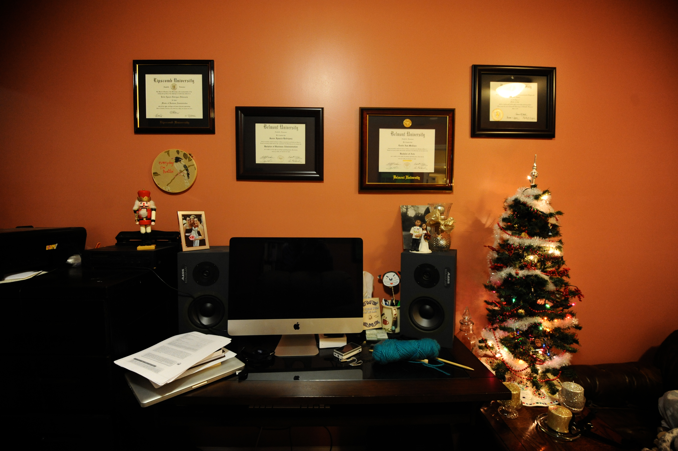 While we were out and about, my mom let me know that Michael’s was having a sweet Sunday sale with 25% off all items and  an additional 25% off if you had a coupon from the Sunday paper. We needed 2 diploma frames – one for Javier’s college diploma and another one for my master’s diploma. I already had my college one framed and Javier bought a frame from Lipscomb for his MBA diploma. My BA diploma has been hanging up all by its lonesome on the wall above my desk – and off center, since we were planning on putting Javier’s next to mine – since we moved in. We FINALLY got the rest of them up this weekend – it looks great! The frames don’t match…but that’s sort of a policy in this household…very few things match, to the chagrin of my very symmetrical-loving brother. Below is a photo of the finished product! Sweet!! Aprovechando que estabamos en la onda de comprar decoraciones, mi mama nos aviso que habia una liquidacion y promocion en Michael’s con toda la tienda rebajada un 25% mas un cupon de un 25% menos que salio en el diario. Necesitabamos 2 cuadros para diplomas – one para el titulo de Javier y otro para mi maestria. Yo ya tenia el mio de la universidad y Javier habia comprado un marco para su MBA. Mi diploma era el unico colgado solo en la muralla mientras esperabamos para comprar el resto de los diplomas. POR FIN los tenemos todos y se ve GENIAL! Los marcos no son iguales, pero eso lo hace ver mas interesante y la verdad es que preferimos cosas que no coordinan. Aqui va una foto del producto final! Muy bakan!!!