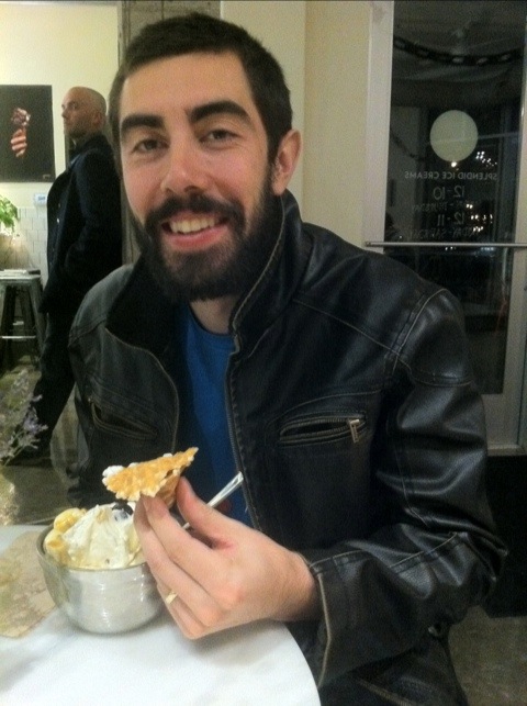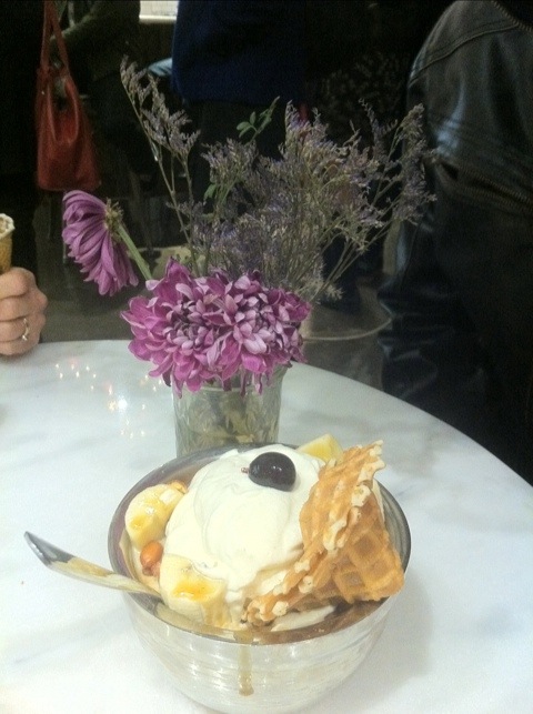 | We went to Jeni’s last Saturday night with my mom and gma after eating dinner and listening to jazz music at the Family Wash (I told you this would become a regular thing…). I wish I could remember exactly what everyone ordered…I had two scoops, one of Buckeye State and one Salty Caramel. My mom and gma both got brown butter almond brittle for their first scoop…but I can’t remember their second ones. Javi got a sundae (I still can’t believe he ate a sundae after eating an entire shepherd’s pie and drinking a stout!) called One Night in Bangkok – it had the Bangkok peanut flavor with a banana and whipped cream…he couldn’t finish it. Spicy ice cream isn’t really my thing (but apparently salty ice cream is) – but he loved it. | Fuimos a Jeni’s el Sabado en la noche con mi mama y mi abuela despues de cenar y escuchar Jazz en el Family Wash (les dije que esto se tornaria en algo regular…). No me puedo acordar que fue lo que pedi exactamente…tenia dos bolas de helado una era Buckeye State y la otra Caramelo Salado. Mi mama y abuela pidieron mantequilla cafe de almendra para la primera bola..pero no me puedo acordar de las segunda. Javi se pidio un sundae (todavia no puedo creer que se comio un sundae despues del shepherd’s pie y la cerveza que consumio antes!) llamado Una Noche en Bangkok – tenia el sabor de mani de Bangkok con platano y crema…no se lo pudo terminar todo. Helado picante no es lo mio (parece que lo mio es helado salado) – pero a el le encanto! |