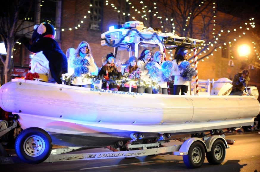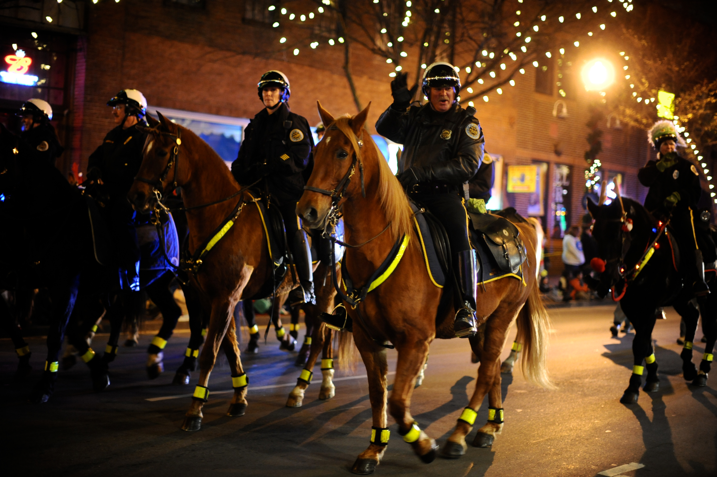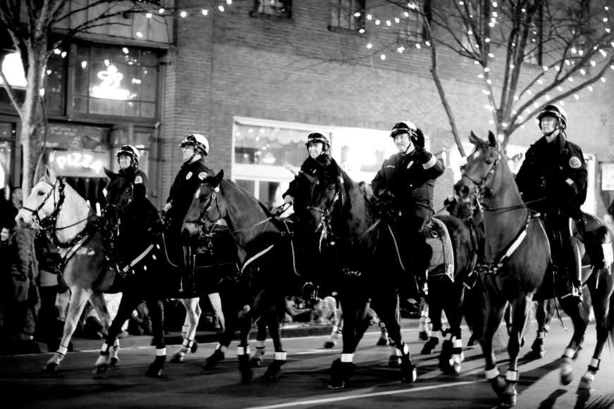 We calmed them down, a very patriotic Rudolph passed us, then the horses trotted by, which we expected would cause trouble but horses apparently don’t scare our dogs nearly as much as sirens and flashing lights.