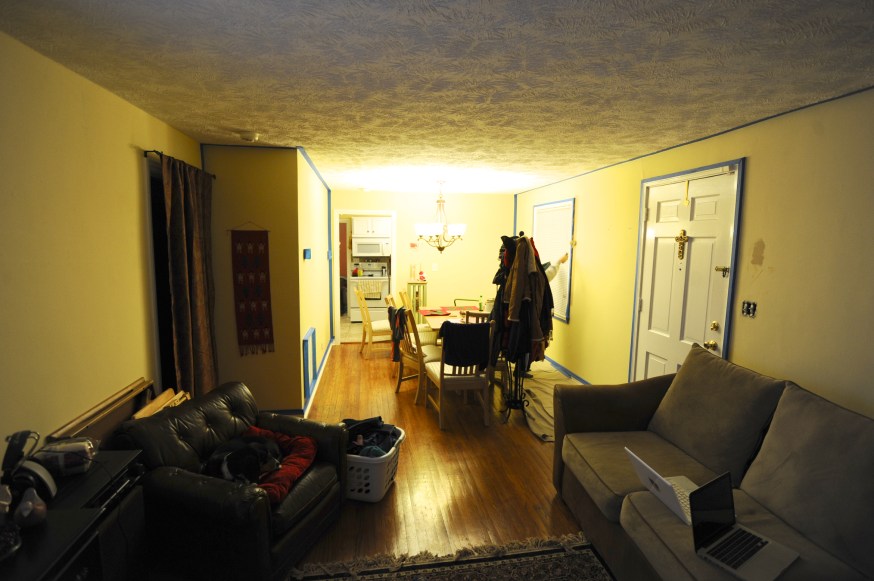 I feel like I’m sitting in a totally different house right now – Javi and I painted our living / dining room!! We started on our anniversary (so romantic…try not to be too jealous of our pizza and beer anniversary dinner) and finished yesterday, just in time for Javier’s parents to arrive. I’m so happy they don’t have to experience our extremely yellow house. Besides the fact the the new colors are great, it also adds a little “Los Rodriguez” touch – the light yellow was never our thing. Light, pastel colors don’t fit well with our personality; Javi and I always prefer bold colors and we wanted something that would bring out the white trim. Someday we are going to add crown molding and then it’ll really look good. Siento que estoy sentada en una casa totalmente diferente ahora – Javi y yo pintamos el living/comedor! Emepzamos en nuestro aniversario (tan romantico…traten de no ponerse celosos de nuestro aniversario con pizza y cerveza) y terminamos ayer, justo a tiempo para las llegada de los papas de Javier. Estoy tan feliz que ellos no tendran que experiementar nuestra casa EXTREMADAMENTE amarilla. Aparte del hecho que el color nuevo es genial, le da un toque de “Los Rodriguez” – el amarillo nunca fue neustro color. Colores pasteles y suaves no se ajustan a nuestra personalidad; Javi y yo siempre hemos preferido colores nitidos y queriamos algo que acenturara nuestras ventanas y puertas. Algun dia pondremos molduras en en techo y ahi si que se vera increible.