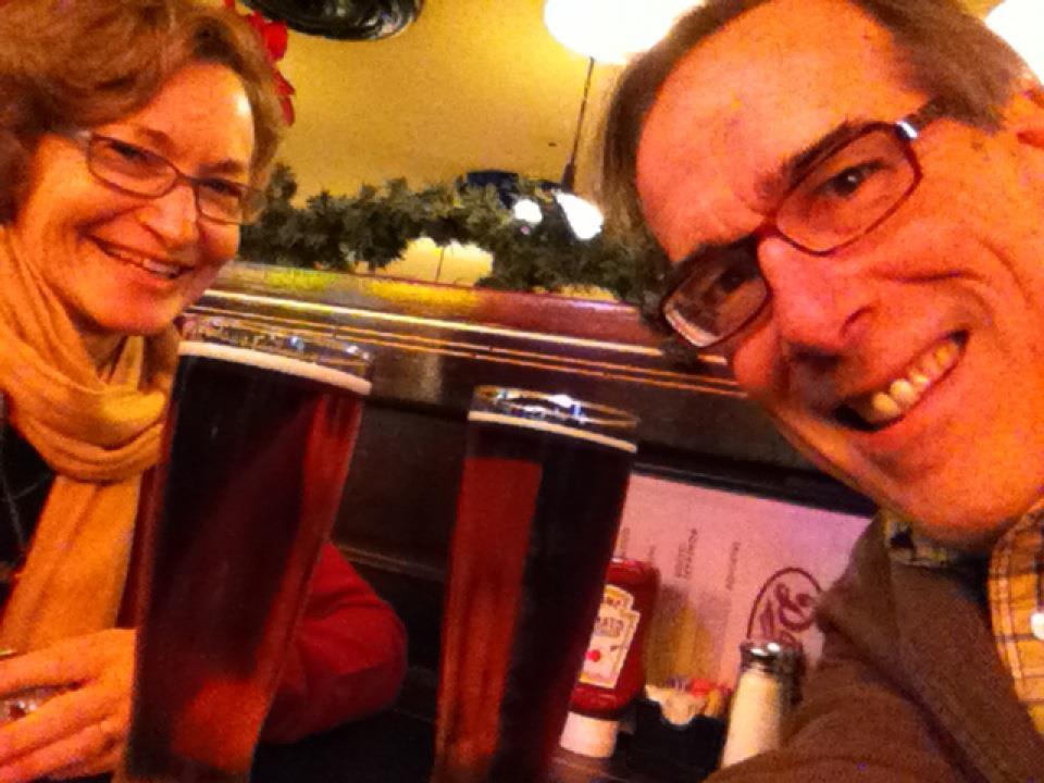 No es solo nuestro aniversario en Diciembre, sino que tambien el aniversario de mis papas y los papas de Javier. El aniversario numero 34 de mis papas fue el pasado Viernes, 16 de Diciembre. Abajo va una foto de su cerveza de celebracion en Dalt’s – todavia una pareja muy tierna! 🙂