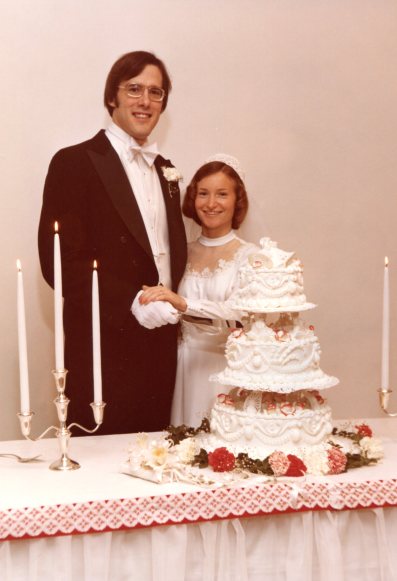 Mis papas tuvieron mas o menos 600 invitados en su matrimonio, la mayoria debido a que mis dos abuelo eran pastores en iglesias enormes y ambas congregaciones fueron invitadas. La linea de recibimiento fue tan larga que nunca pudieron llegar a su fiesta! La foto de ellos con su torta fue tomada ANTES de la ceremonia – ellos no puedieron probarlo despues de la ceremonia.