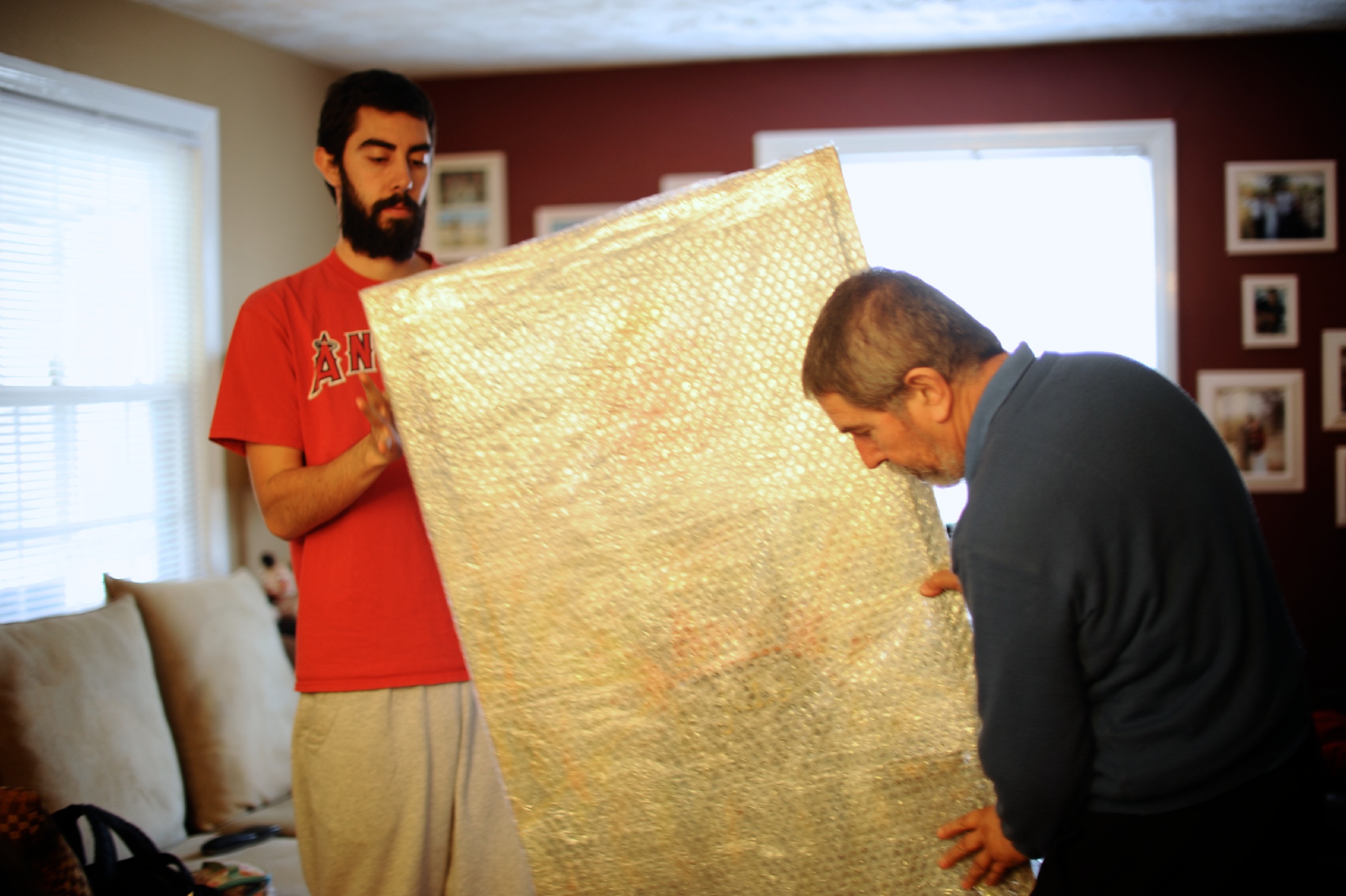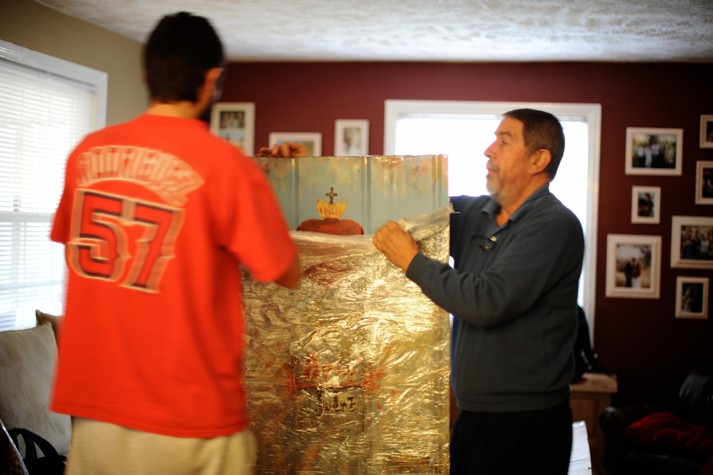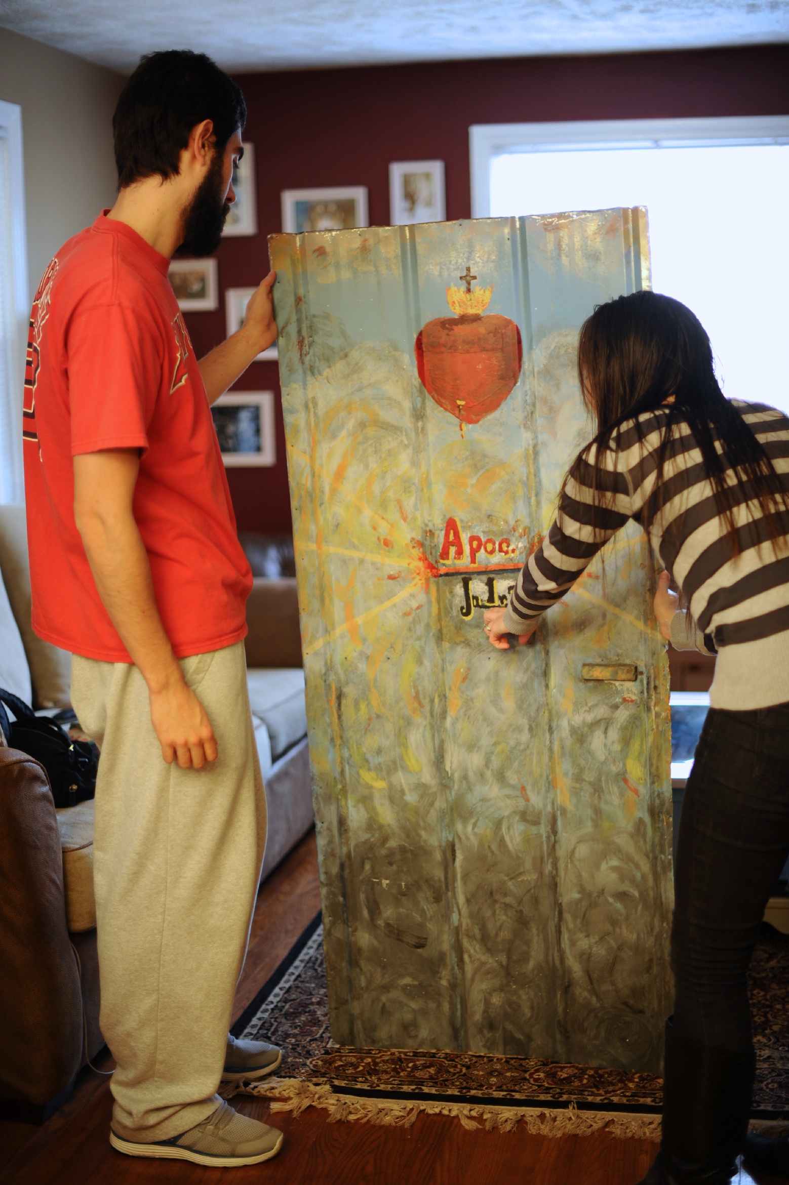 | About a year ago, Javier’s grandparents moved from that house to an apartment, which meant the door was at the mercy of whoever moved into the house. I offhandedly mentioned that it was too bad that we couldn’t keep the door and how much I would love to have it here as art and family history, but I never ever imagined that it would be possible. Javi spoke with his parents, though, and suddenly everything was set in motion to bring the door to Santiago. They removed the door and replaced it with a new one, then drove the door up to Santiago. It stayed at his parents house for a few months, and after much difficulty they were finally able to figure out how to bring it as luggage labeled as art. Before they could ship it as art, though, they had to have it certified at the Museum of Fine Arts in Santiago. So they took the door to the museum and they inspected it and certified it but it had to have a name for the certificate. So Pancho and Meri named it “Apocalipsis” and that was that. They packed it up with layer after layer of bubble wrap and cardboard, and shipped it along with their luggage! | Mas o menos un ano atras, los abuelos de Javier se mudaron de su casa a un departamento, lo que significaba que la puerta quedaba en manos de los proximos duenos de casa. Yo mencione que era una pena no poder quedarnos con la puerta y lo tanto que me gustaria tenerla con nosotros como arte de la historia familiar, pero nunca nunca me imagine que seria posible. Javi hablo con sus papas y de repente todo estaba puesto en movimiento para llevar la puerta a Santiago. Se quedo en casa de sus papas por unos meses, y despues de mucha dificultad pudieron encontrar la manera de enviar la puerta en el equipaje marcada como arte. Antes de poder enviarla, tuvieron que certificarlo en el museo de Bellas Artes en Santiago. Asi que llevaron la puerta al museo y ellos la inspeccionaron y certificaron, pero habia que ponerle un nombre para certificarla. Asi que Pancho y Meri la llamaron “Apocalipsis”. La empaquetaron con varias capas de plastico con burbujas y carton, y la mandaron en el equipaje! |