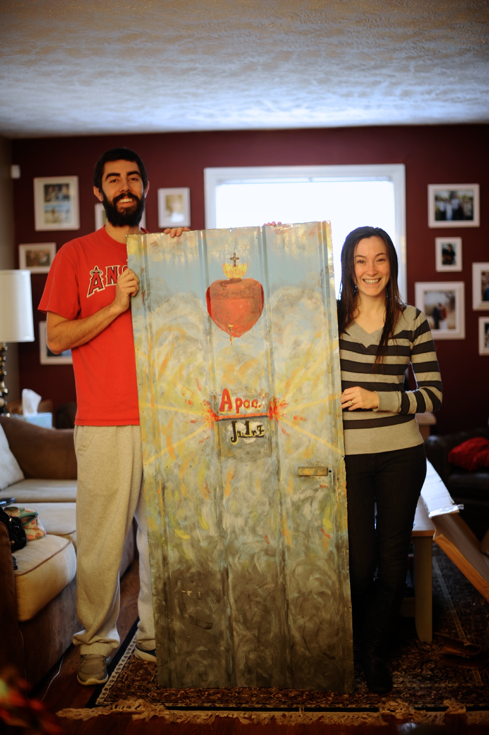 | I cannot BELIEVE we actually have this door in our house. To add to the complication, we can’t tell Javier’s grandfather! He was adamant about leaving the door where it was, but his parents knew that it would either be destroyed or removed and they didn’t want to lose it. His grandfather used to paint when he was younger and apparently his art teacher brought all of his paintings back to her house to decorate, so we don’t have any paintings from his grandfather left. I can’t tell you how happy we are to have this amazing piece of family history on our wall!! That’s the final part of the story – Javier mounted the door (which is too small to actually serve as a door here) on our living room wall where everyone can see it. I feel like our house is complete! | No puedo creer que la puerta este en la casa! Para agregar complicacion, no le podemos decir al abuelo de Javier! El estaba firme en dejar la puerta donde estaba, pero sus papas sabian que seria destrozada y removida y no la querian perder. El abuelo de Javier solia pintar cuando joven y aparentemente su profesora de arte se quedo con todas las pinturas en su casa para decorarla, asi que no tenemos mas pinturas de su abuelo. No te puedo decir lo feliz que estoy con la puerta en nuestra casa, un pedazo de historia familiar en nuestra muralla!! Esa es la ultima parte de la historia – Javier colgo la puerta (la que es muy pequena para ajustarse en una puerta de nuestra casa) en nuestro living / comedor para que todos puedan verla. Siento que nuestra casa esta finalmente completa! |
