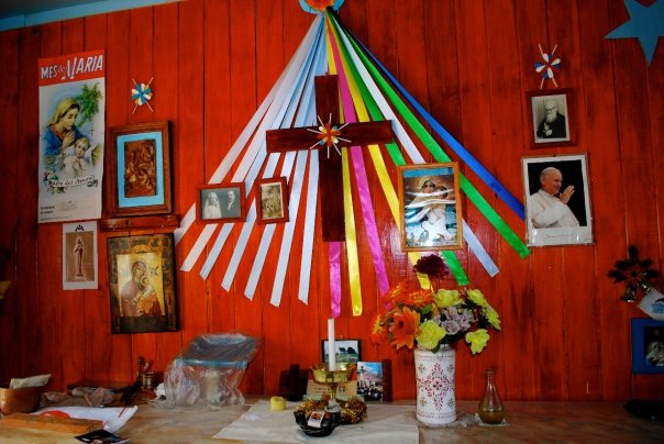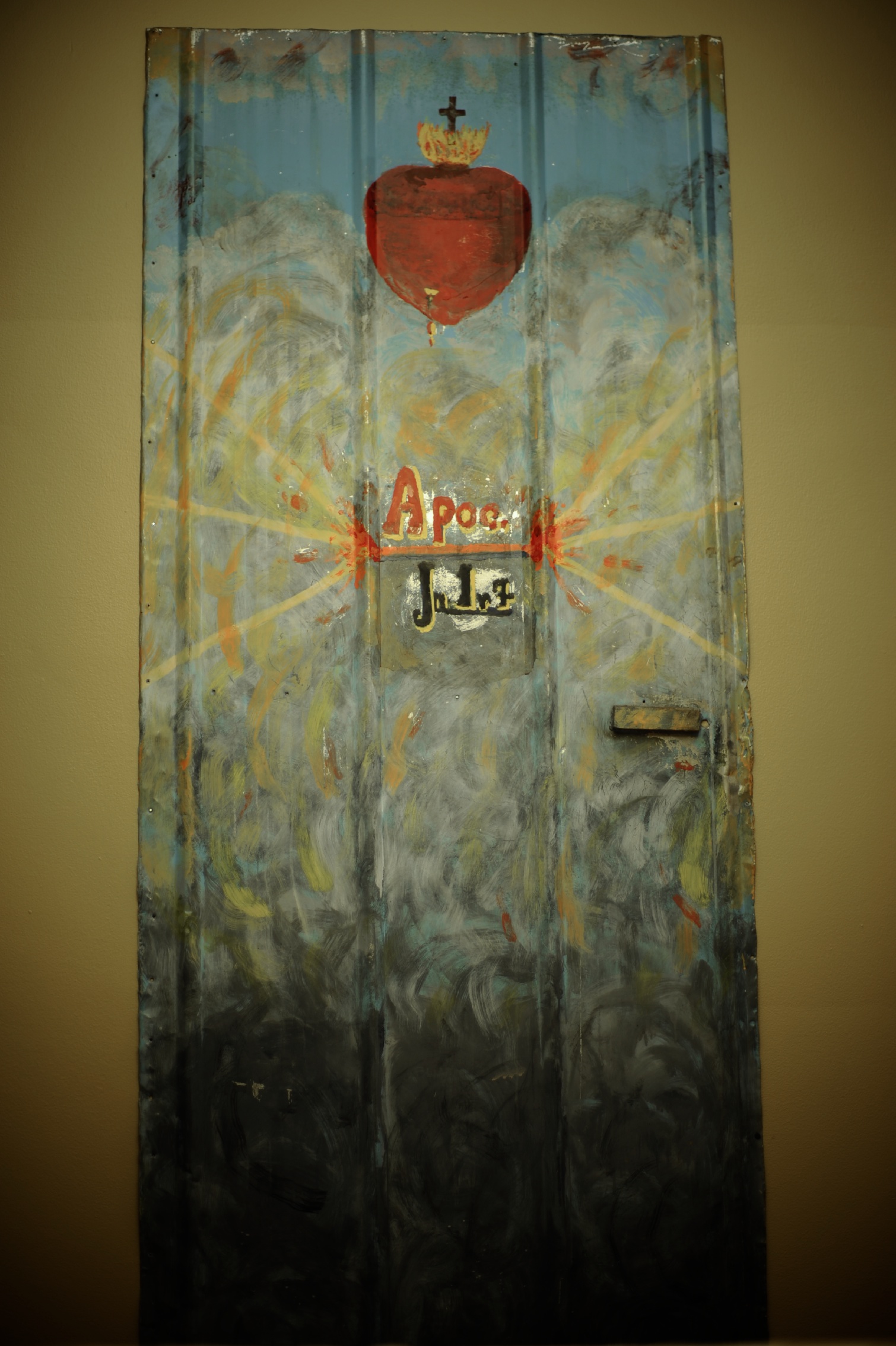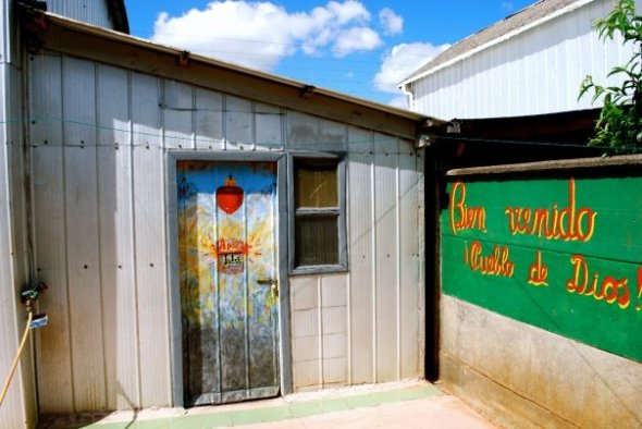 | The whole sanctuary was painted bright colors and he had beautiful ribbons hanging from the wall with photos and paintings strung on the ribbons. Everything was so perfectly in its place…and for a minute I was crestfallen because Javier told me I couldn’t take photos, but then his grandfather said that of course I could take photos and immediately posed with Javier in front of his work bench. It was such a great moment! The most jaw-dropping art in all of this, though, was the door that marked the entrance of the sanctuary. He had painted the door to follow John chapter 1 verse 7 in the Bible and it’s just breathtaking. I fell in love with the door right away, and took a few photos of it. | Todo el santuario estaba pintado con colores my vivos y tenia cintas muy bonitas colgadas de la muralla con fotos y pinturas sujetadas con las cintas. Todo estaba puesto en su lugar perfecto….y por un minuto me dio mucha pena porque Jvier me dijo que no sacara fotos, pero despues su abuelo me dijo que por supuesto podia sacar fotos, y de inmediato se puso con Javier al frente de su mesa de trabajo. Fue un gran momento! El articulo de arte que hizo que se me calleran la mandibula, en todo casa, fue la puerta que estaba a la entrada del santuario. El pinto la puerta siguiendo la escritura de Juan 1 versiculo 7 en la biblia y era para perder el aliento. Me enamora de la puerta de inmediato, y saque un par de fotos. |