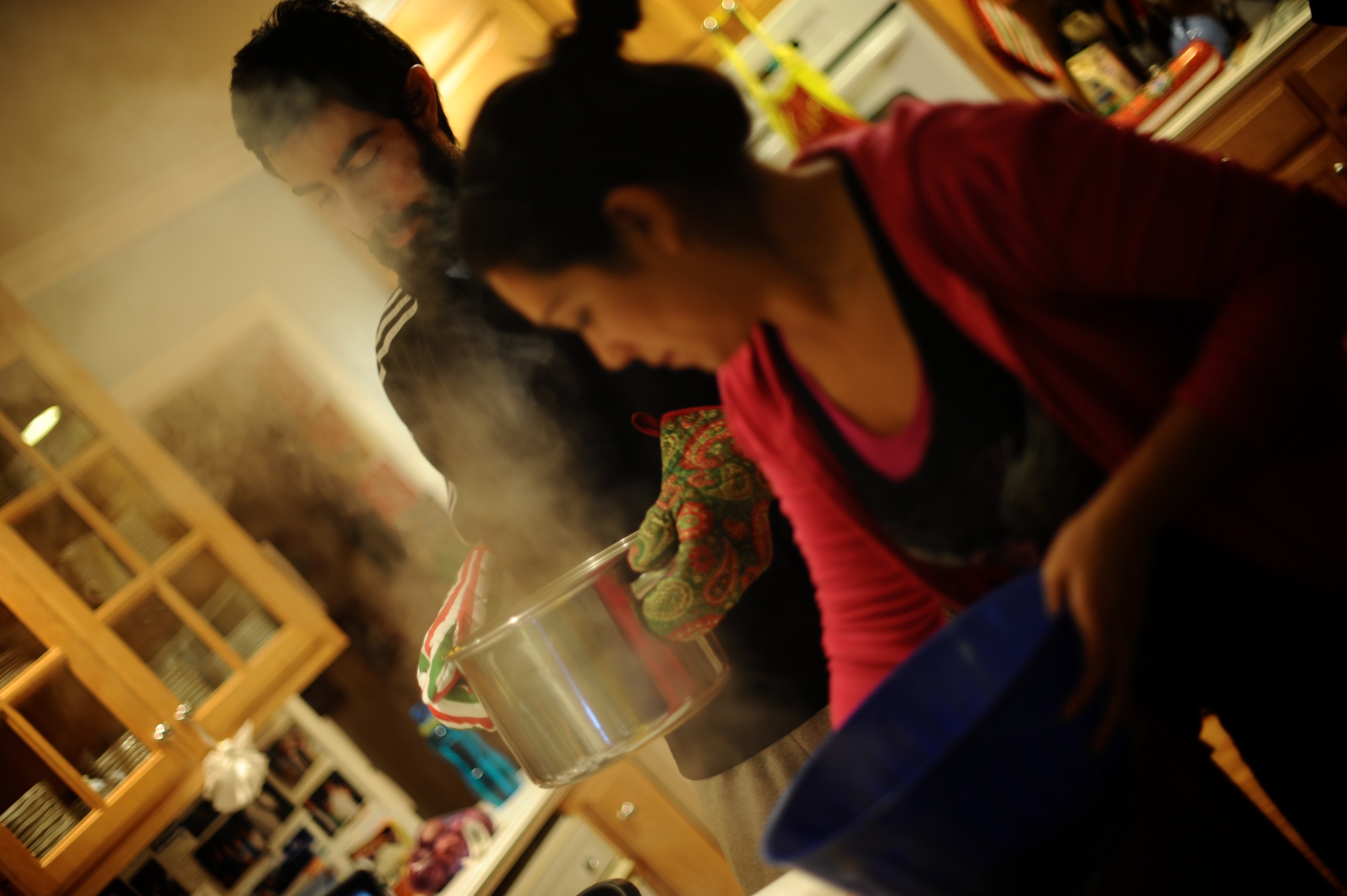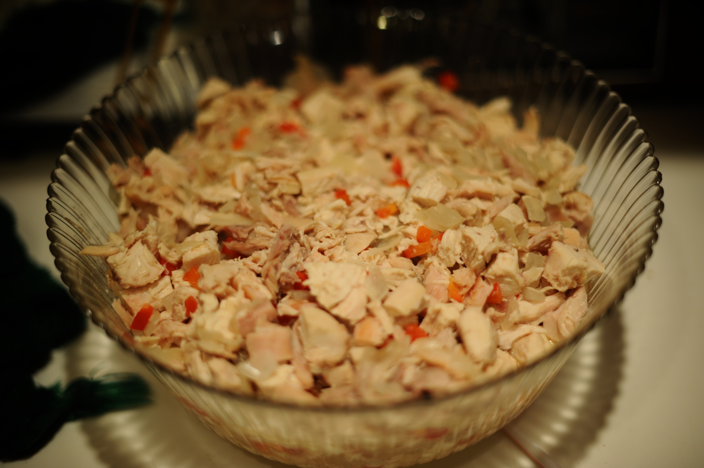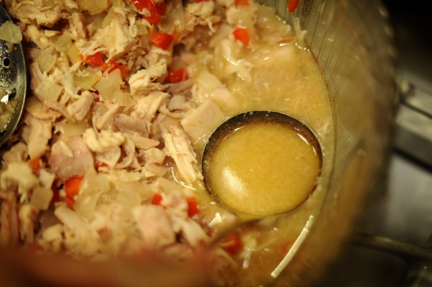 After the dicing, they threw the corn bit by bit in the blender to make a kind of paste out of it. Normally I think we would have done this in a food processor but we were cooking in my parents kitchen and they didn’t have one. Once the corn was a paste, Paula put it back into the big pot. Then she added the chopped basil, some of the red pepper and a little more salt to the corn paste so the flavor could start mixing. While the flavors were left to marinate, my gma and Paula diced 6 onions. Next, Paula put the diced onion in a different pot and boiled it in water with a little sugar and salt to get rid of the acid flavor. You don’t want the sugar flavor to stay, so after the onion is well cooked you wash the onion with fresh water to get rid of the sugar. Then Paula put half of the diced onion in a pot with the chicken along with the rest of the red pepper that wasn’t mixed with the corn paste. She poured the two cups of wine in with the chicken,more salt (maybe 2 teaspoons) and a spoonful of olive oil. She put this mix on the stove with the fire on low for 15 minutes. Then she took the chicken off the stove and put it in a bowl with the wine to marinate for awhile. Despues de picar los pimientos y la albahaca, Paula puso el choclo en la juguera poco a poco para hacer una pasta. Normalmente creo que hubieramos usado un procesador de comida pero como estabamos en la cocina de mis papas y ellos no tenian uno, ocupamos la juguera. Despues de hacer la pasta, Paula puso la pasta de vuelta en la olla con la albahaca y pimiento picado con un poco de sal para dejar que los sabores se mezclen.Mientras los sabores se impregnaban, mi abuela y Paula picaron 6 cebollas. Para hacer el pino para el pastel, se cocina primero la cebolla en agua con un poco de azucar y un poco de sal para sacarle lo acido. Despues de cocinar la cebolla, lavala con agua para sacar el azucar. Paula puso la mitad de la cebolla picada en otra olla con el pollo y tambien con el resto del pimiento que no fue mezclada con la pasta de choclo. Echó doz tazas del vino blanco en la olla con el pollo, mas sal (a su gusto), y una cucharada de aceite de oliva. Puso esa olla encima del fuego bajo por 15 minutos. Despues, sacó la olla del fuego y puso el pollo en un bowl con el vino para impregnar el pollo con el sabor del vino.