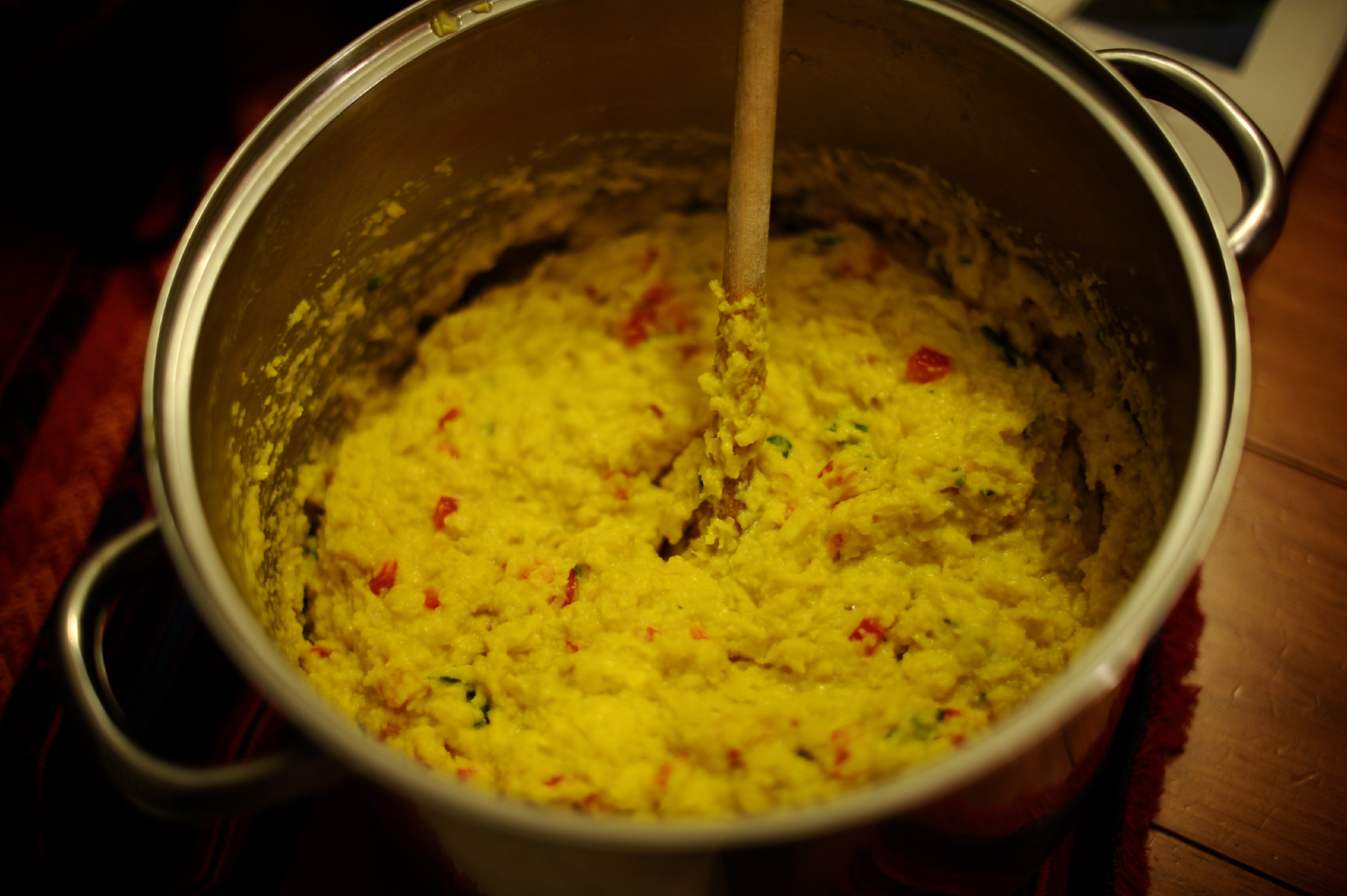 First, my gma diced up the chicken into little pieces and then Paula threw the juice from the chicken over the diced pieces. While my gma was dicing, Paula put all of the corn in a huge pot and set it to boil. She threw in salt – she probably tossed in half of a salt shaker. Then they both diced up the bell peppers and basil. Primero, mi abuela picó el pollo en pedacitos y despues Paula echó el jugito del pollo encima de los pedazos de pollo. Mientras mi abuela picó el pollo, Paula puso el choclo en una olla grande con agua y lo hirvió – 25 minutos mas o menos. Echó sal – como la mitad del salero que tenemos (2 cucharadas). Depues, ella picó los pimientos y la albahaca.