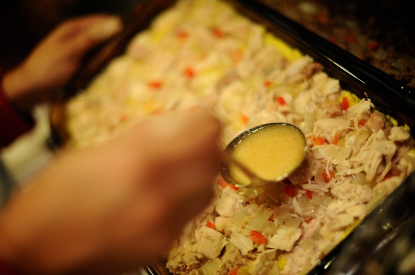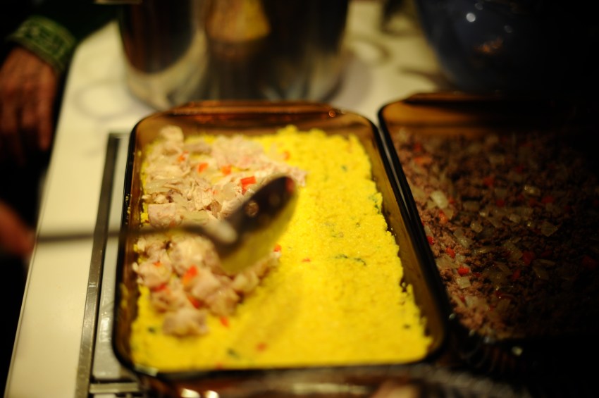 Next, she started to heat the oven to 355. To prepare the ground beef, Paula took out yet another pot on the stove and put a bit of olive oil and salt on the bottom. She put the meat in the pot in small pieces and stirred it up, the put the rest of the onion that did NOT go into the chicken into the meat. She stirred in two tablespoons (about) of oregano into the meat. After the meat was well cooked, she made a layer of the ground beef mix on the bottom of three glass pans (9×13). Then she made a layer of the corn on top of the beef, followed by a layer of the chicken on top of the corn. Then she took some of the wine / chicken sauce that was sitting in the bowl with the chicken and poured some of it over the layer of chicken. Heat oven to 355. Beat one egg and spread the egg out on top of the last layer of corn. Then put each casserole in the oven for 30 minutes, and then let it cool and you’re ready to eat!!! Para preparar el pino de carne, Paula puso una base de aceite de oliva con sal en otra olla y hecha la carne a la olla en pequeños trozos. Luego iba separando y agregó la cebolla que no hechó con el pollo. Hechó dos cucharadas de oregano en la mezcla. Una vez que la carne estaba bien cocida, hizo un capa de carne primero, luego una capa de choclo y una capa de pollo. Encima del pollo, ella hechó unas cucharadas del vino y jugo del pollo. Despues, puso una capa final de choclo encima del pollo. Ella calentó el horno a 355 grados farenheit. Batió un huevo y de a poco esparció por la superficie de cada pastel. Depues colocó los pasteles en el horno por 30 minutos. Despues de los 30 minutos sacó los pasteles del horno y despues de enfriar un poco esta listo para comer!!