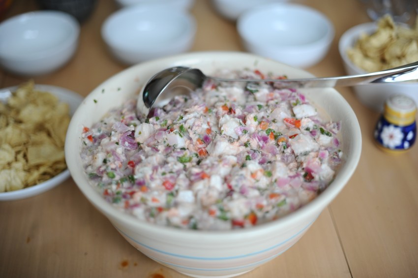 | I told you all Paula spoils us – last night in addition to making 3 pans full of pastel de choclo, she also made a serving of ceviche big enough for 10 people and MORE for lunch today. It sat all night long marinating in lemon juice and it was fabulous. I’ll put the recipe up here eventually – but she used tilapia and salmon. So delicious!!! | Les dije que Paula nos malcria – ayer ella nos hizo los pasteles de choclo y ademas de eso una porción de ceviche suficiente para alimentar 10 personas y mas para el almuerzo de hoy. El ceviche pasó toda la noche mezclando los sabores y fue fabuloso. Pondré la receta aquí algún día – pero ella usó tilapia y salmón. Delicioso! |