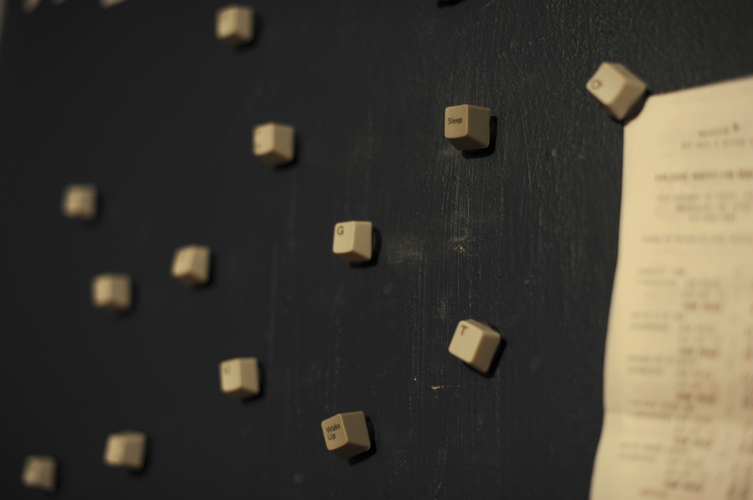 I didn’t actually read the instructions because it seemed (and was) pretty easy to do. Javi and I went to goodwill and bought a cheap keyboard for $4 and 48 disc magnets from Office Max. We washed the keyboard and took out 48 of our favorite keys (all the letters and numbers plus a few commands like “power,” “enter,” “esc,” – the fun ones) and Javi took them down to the workshop to cut off and sand down the little tubes on the backside of the keys. Once he had them all ready I put superglue on the edges of the little circle under the keys and glued the magnetic discs on the back and voila! Keyboard magnets. Minus the trip to Goodwill, it took about 45 minutes to make these. They look awesome in the office, I must say, and work pretty well!