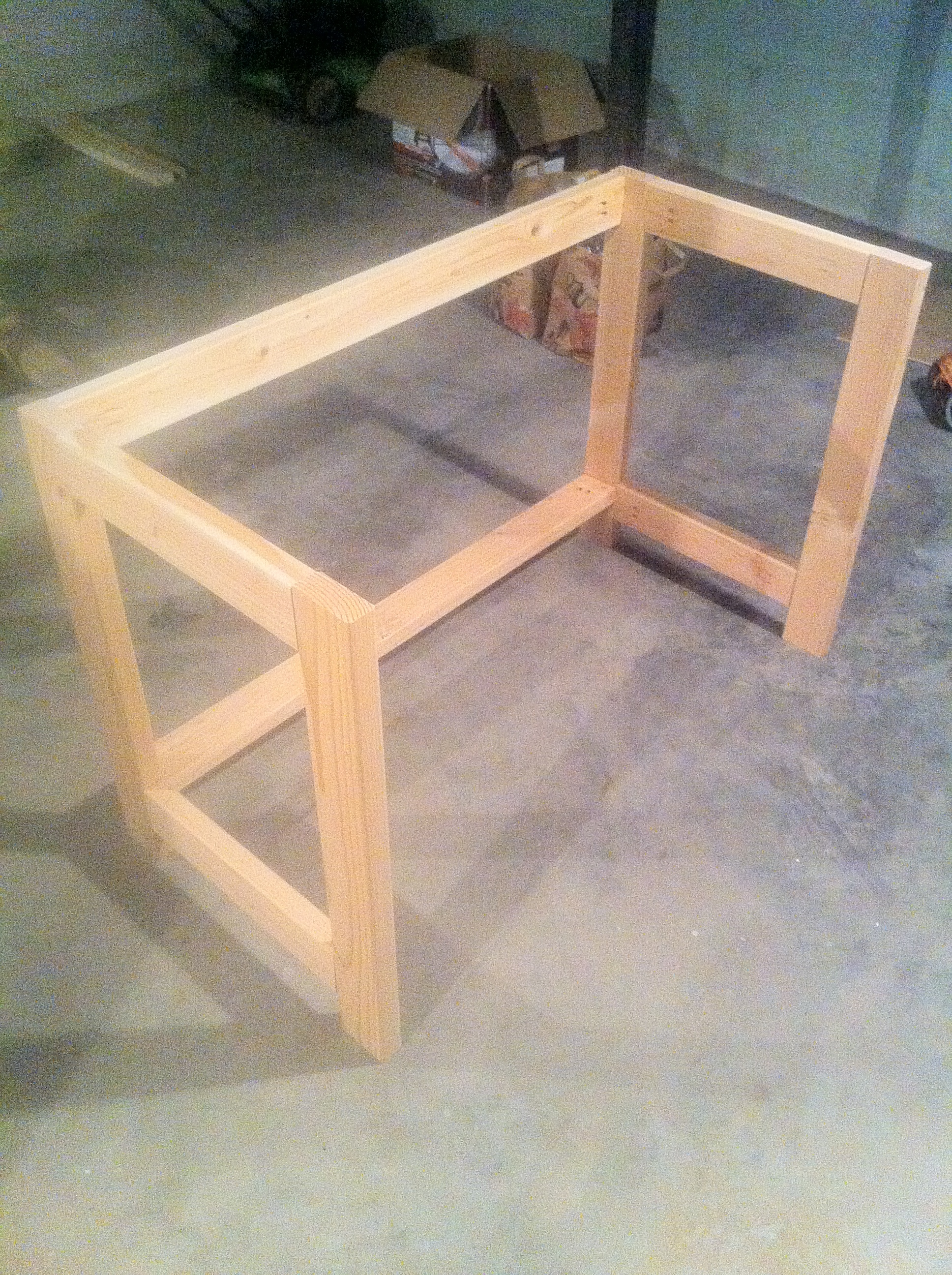 | Since we wanted to have a new office that we could both use, we needed to have desks for both of us. We would love to have two big old desks with plenty of drawers, leather top, shiny old wood and with a big work area…but those desks usually come with a price tag out of our range. So I thought for a few minutes and came up with a plan to make a big desk with few resources and little effort. I came up with the most basic design that would provide a big work area (which is the most important feature for us – we both tend to spread out). Since I was interested in making them inexpensive and quick, I forgot about drawers or super high quality wood (I used the best wood for the price). This is the plan for my desks (one for Leslie and one for me – identical): | Ya que queríamos tener una nueva oficina que se los dos pudiéramos utilizar, necesitábamos tener mesas de trabajo para los dos. Nos encantaría contar con dos escritorios antiguos, grandes, con un montón de cajones, tapa de cuero, madera vieja y brillante y con un área de trabajo grande … pero esos escritorios por lo general vienen con un precio fuera de nuestro alcance. Así que pensé durante unos minutos y se me ocurrió un plan para hacer un gran escritorio con pocos recursos y poco esfuerzo.Pensé en el diseño más básico con una gran área de trabajo (que es la característica más importante para nosotros – que los dos esparcimos nuestras cosas). Como estaba interesado en hacerlos baratos y rápido, me olvidé de cajones o de madera de super alta calidad (he utilizado la madera de mejor calidad por el mejor precio). Este es el plan para mis escritorios (uno para Leslie y otra para mí – idénticos): |