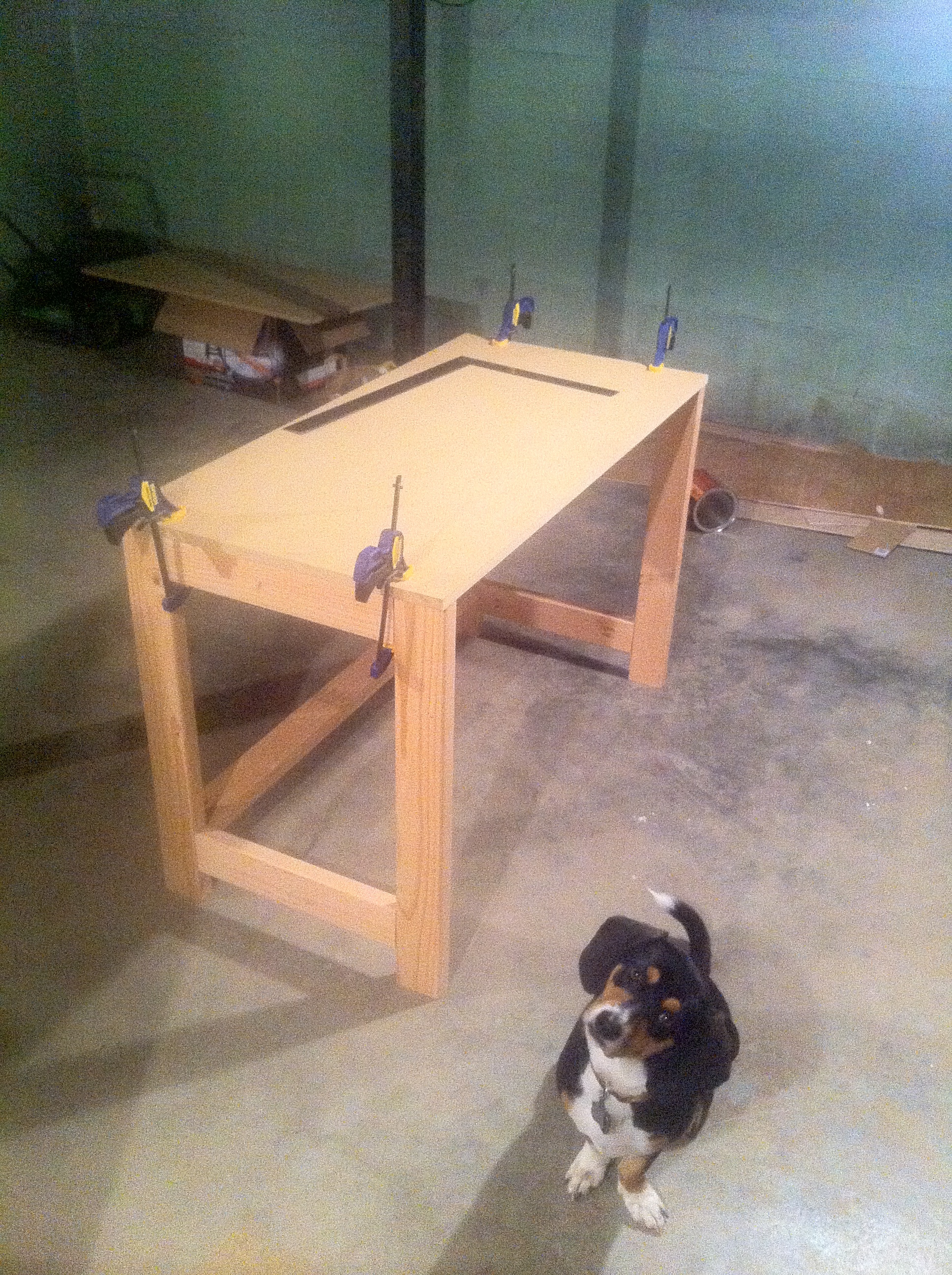 | The best thing about building your own desk is that you decide the height! I hate when tables or desks are too low and I end up looking like I’m 120-years-old trying to read something while bending over. So, using a miter saw, I cut 8 legs about 30″ tall. I made all the cuts at once to ensure the same length in every piece. I cut 8 short supports for the sides and 4 long supports for the back side of the desk. Using my Kreg Jig (get one if you don’t have one – it will save you time and will make your final product much better) I attached all the pieces, starting with the side panels. Next I attached the long supports to the panels and the main part of the desks were done! I glued the top to the structure, clamped it and let it dry for 24hrs (Chori was in charge of guarding the new desks!). Once thing I would recommend if you are thinking about trying to build your own desk….always make sure you have straight cuts and 90 degree joints. You want your furniture to be level, so measure twice and cut once. It takes a little longer, but ensures a great final result. | Lo mejor de construir tu propio escritorio es que uno decide la altura! No me gusta cuando las mesas o escritorios son muy bajos y termino pareciendo como si tuviera 120 años de edad, tratando de leer algo.Por lo tanto corté 8 patas cerca de 30 ” de altura. Hice todos los cortes de una vez para asegurar la misma longitud en cada pieza. Corté 8 soportes cortos para los lados y 4 soportes largos para la parte de atrás. Use mi Kreg Jig (compren uno si no tienen uno – les ahorrará tiempo y hará que su producto final se vea mucho mejor). Uní todas las piezas, primero los paneles laterales. Luego uní los soportes largos y con eso la estructura principal estaba lista. Pegué la parte superior de la estructura, la fije con sujetadores y los deje secar durante 24 horas (Chori fue el encargado de velar por los escritorios!). Una cosa que les recomendaría es si están pensando es trata de construir su propio escritorio…. siempre asegúrense de tener los cortes rectos y uniones en 90 grados. Quieren que sus muebles estén nivelados, así que midan dos veces y corten una. Se demora un poco más, pero se asegura un gran resultado final. |