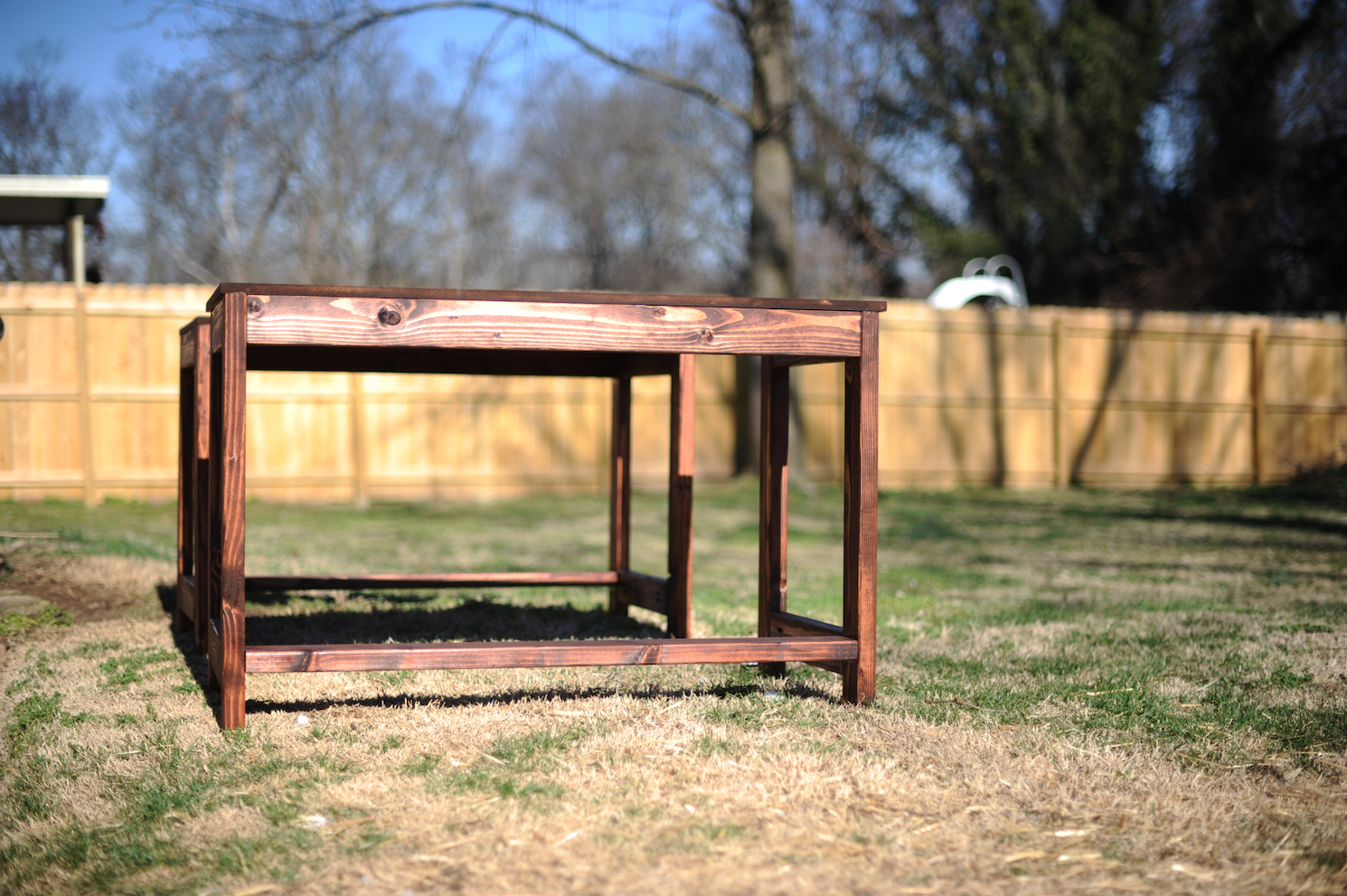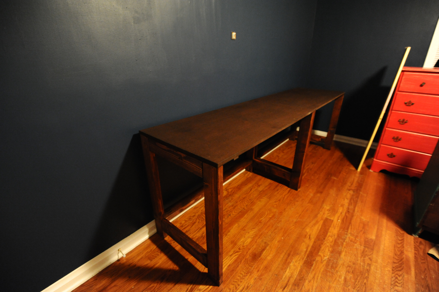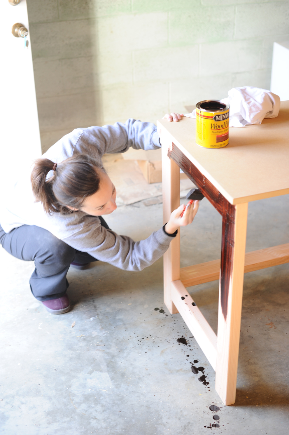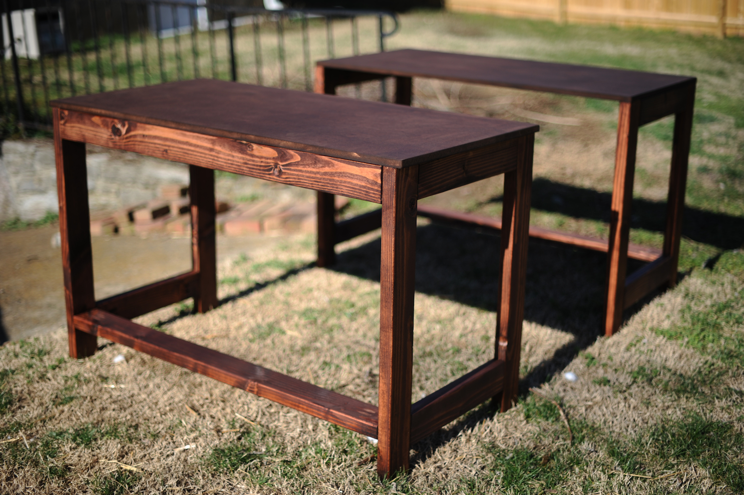 | Once everything was dried, we proceeded to stain the desks a dark wood color. The pine takes the stain really well, but the MDF will absorb it like a sponge, so it takes a long time for the strong smell to go away (we are still suffering). If you don’t want to stain it, you can paint it any color or leave it natural, it’s your desk! We love having these nice working areas and it makes it much more enjoyable to think that you built the furniture you are using. And for $25 a piece….even better! Pottery Barn what?! | Una vez que todo se secó, pusimos el barniz. El pino toma el barniz muy bien, pero el MDF lo absorberá como una esponja, por lo que se necesita mucho tiempo para que el fuerte olor se vaya (nosotros aún sufrimos). Si no quieren barnizar, se puede pintar de cualquier color o dejarlo natural, es tu escritorio!Nos encanta tener estas áreas de trabajo y hace que sea mucho más agradable pensar que nosotros construimos los muebles que estamos usando. Y por $ 25 una pieza…. aún mejor! Pottery Barn qué? |