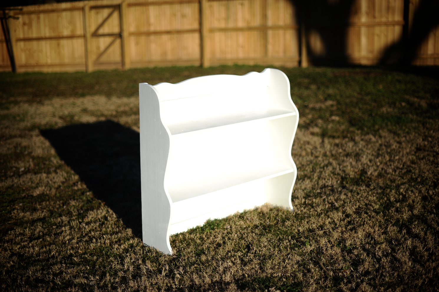 The final product is just what we needed. We now have plenty of space to put all our books in the office, Leslie is happy, the office looks great and it wasn’t hard to finish! We used bricks from outside for our bookends and they look pretty sweet (I scrubbed them with bleach to make sure no little critters were going to be on the shelves with the books). While I was working on the bookshelves, Leslie was refinishing the old hutch that used to sit on top of the teal dresser. We decided it’d be a sweet extra shelf on the wall next to her desk where she can keep all of the books she is using at the moment for her semester. The hutch originally had two shelves but we took a couple pieces of scrap wood, painted them white and added them to the bottom to make a third shelf. It looks pretty sweet floating on the wall without the dresser below it!
