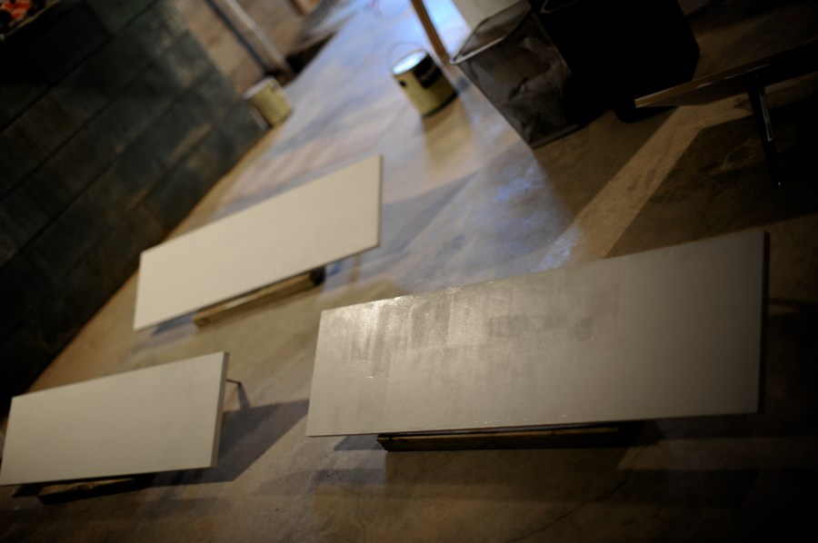 hice un viaje rapido a Lowes y compre soportes en L (8 soportes por $1 cada uno). Despues de eso el resto fue simple. Poner los soportes en las repisas (asegurandome de que estuvieran nivelados y derechos), pintar las repisas blancas (incluyendo la mitad de los suportes) y una vez que los puse en la muralla, pinte la otra mitad de los soportes el mismo color de la pared, haciendolos menos notorios.