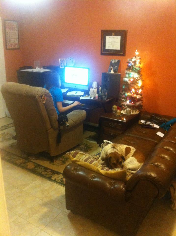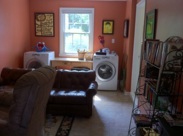 So with the whole office transformation came a few hitches that we had to solve…like where on earth were we going to put two dressers, a mattress and box spring and a wing back chair and recliner. So we took stock of what we wanted to sell (…which only turned out to be the old desk we used in the original office) and moved almost everything else down to the basement. For the time being, Javi can use the dressers to organize his workshop if he wants. We covered the wingback chair and recliner with two gigantic plastic painters drop cloths and put them far away from the door so they won’t get any water from heavy rains (we hardly get any water in the basement and it’s always by the door). I’m really sad to lose the recliner for now…it was so comfortable in the office and Choripan LOVED sitting behind me and keeping me company. We just don’t have room for it! Con toda la transformacion de la oficina, aparecieron un par de problemas que tuvimos que resolver…como por ejemplo donde cresta ibamos a poner las dos comodas, un colchon, un box spring, y una silla de respaldo alto y una reclinable. Asi que pusimos aparte lo que queriamos vender (…lo que termino siendo solo el escritorio antiguo de la oficina original) y movimos todo lo demas al sotano. Por mientras, Javi puede usar las comodas para organizar sus herramientas si quiere. Cubrimos las sillas con dos sabanas plasticas gigantes y las posimos lejos de la puerta para evitar la humedad de las lluvias (casi nunca tenemos agua en el sotano y si algo entra es al lado de la puerta). Estoy muy triste por no poder tener la silla reclinable…era muy comoda en la oficina y a Choripan le encantaba sentarse detras mio y hacerme compania. No tenemos espacio suficiente!