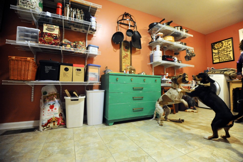 The other great thing is that the doggos have a big open space in there where they can play when it’s raining / too cold / too hot. Those dogs are spoiled. It’s easy for us though – we can shut them up in there and know that they can’t ruin anything and the floor is this tile / linoleum that’s really easy to clean. Javi hung up all of my aprons on the wall where the bakers rack book shelf used to be, and we kept one dresser from the guest room in there to give us some drawer storage (we didn’t realize it until after we moved in, but OUR KITCHEN ONLY HAS ONE DRAWER!!) where we keep table linens and other odds and ends. All in all a great office-to-gigantic pantry transformation! Lo otra parte genial de esta renovacion que el espacio abierto donde los perros pueden jugar cuando este lloviendo / muy frio / muy caluroso. Los perros son “mal criados” por nosotros. Pero es facil para nosotros – podemos cerrar la puerta y dejarlos ahi sabiendo que no pueden destruir nada y el piso es muy faci lde limpiar ya que es de valdosas plasticas. Javi colgo todos los manteles de cocina en la pared y nos quedamos con una de las comodas que teniamos en la pieza de invitados para usar los cajones (porque nuestra cocina tiene solo 1 CAJON!!) y poner los individuales, servilletas y otras cosas. Despues de todo una gran transformacion de oficina a despensa gigante!