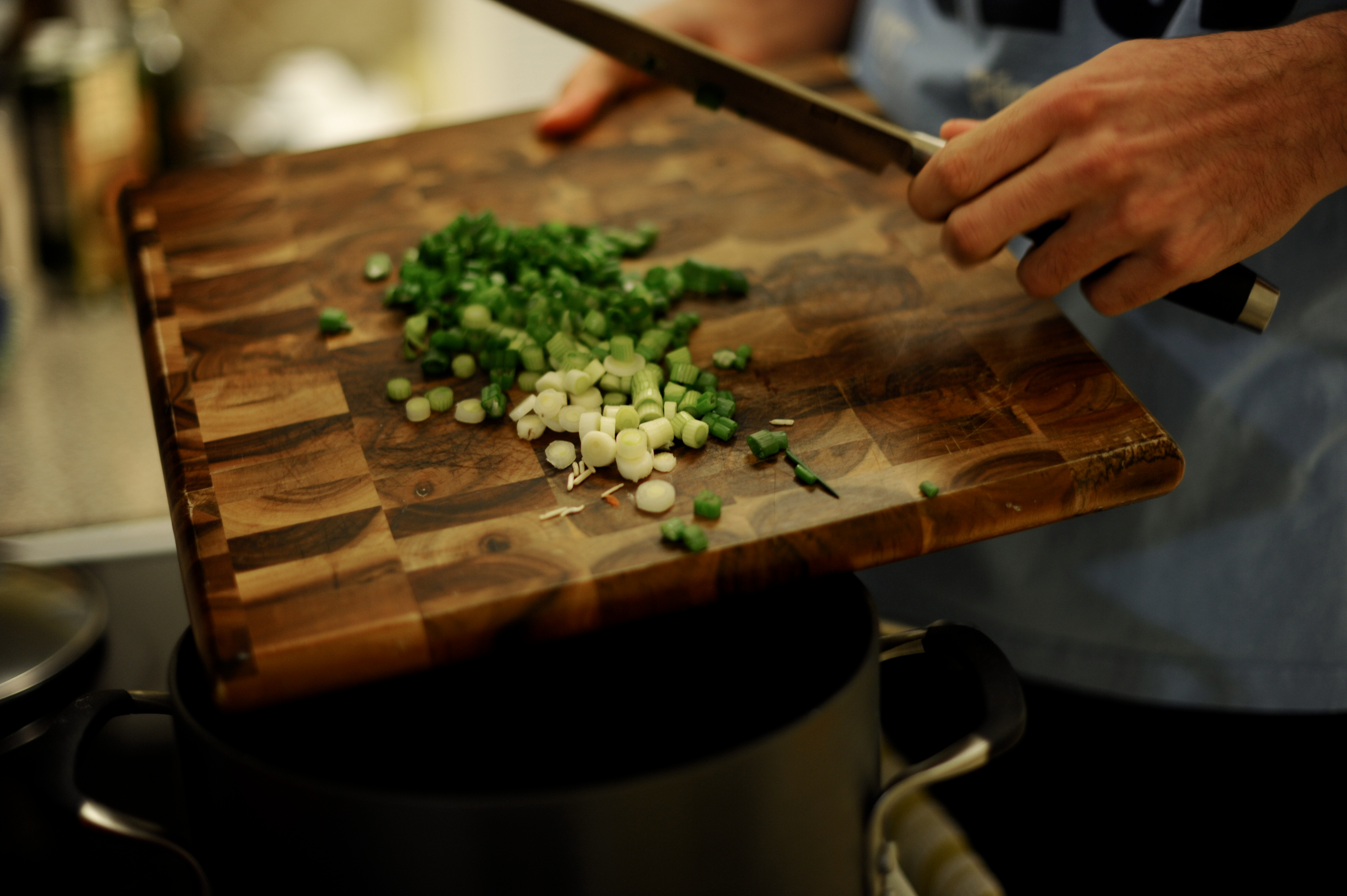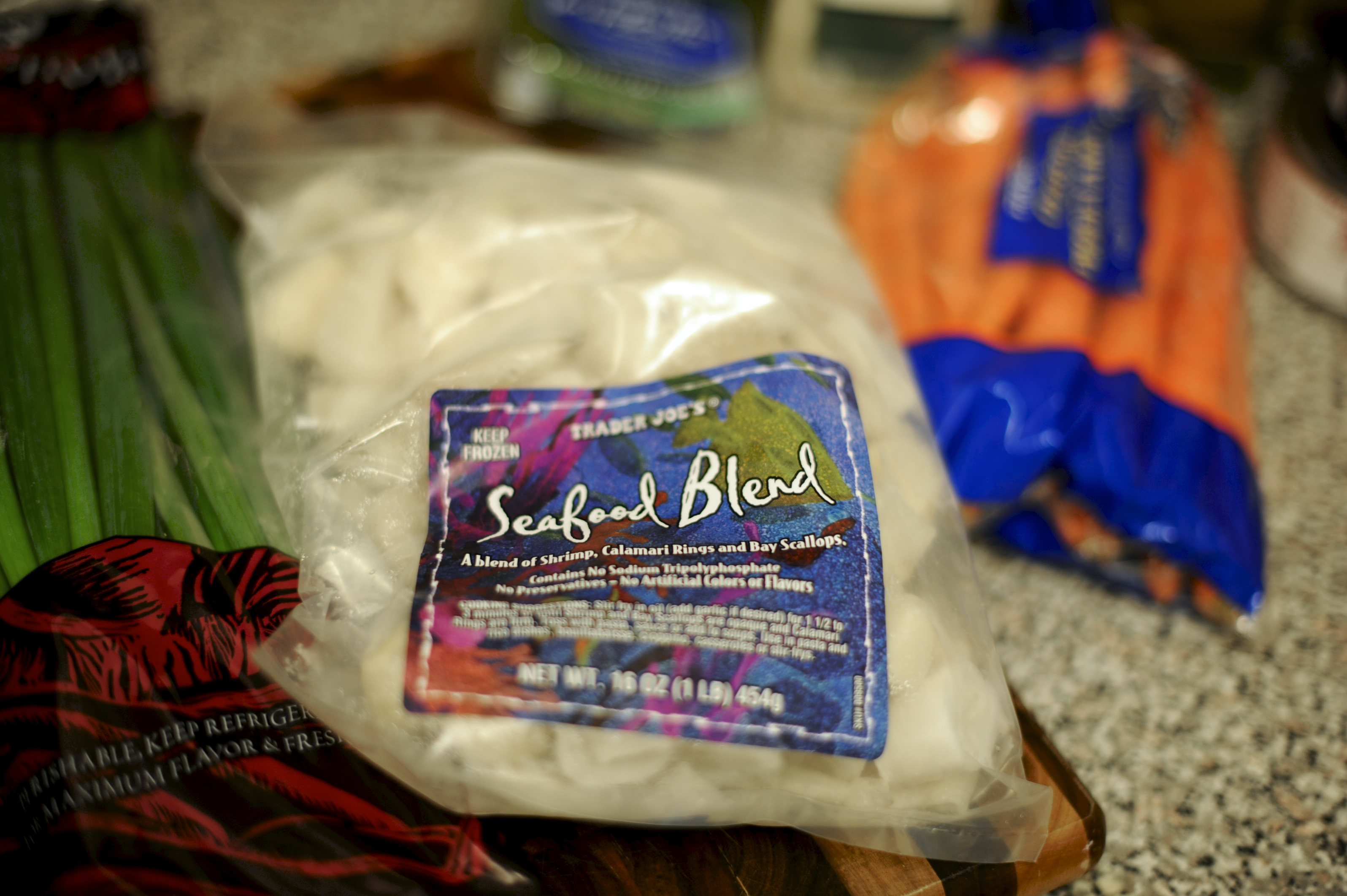 | I took 2 carrots and sliced them into thin circles, sliced up half an onion and chopped about half a packet of green onions and added them a big pot. I poured two boxes of vegetable broth plus a pint of water into the pot over the veggies and added a tiny bit of garlic salt and a tiny bit of merken. I added more regular salt once the soup was ready but I wanted to be careful on the front end and not overdo it. With everything in the pot I put it on the stove on medium heat and covered so it would be ready when I added the seafood. | Tome las 2 zanahorias y las corte en circulos delgados, corte media cebolla estilo pluma y pique mas o menos medio paquete de cebollines y puse todo en una olla. Puse dos cajas de calde de vegetales a la olla mas una cana de agua y un poco de sal de ajo y merken en la olla con los vegetales. No quise ponerle sal porque no queria que quedara salada la sopa, siempre se le puede agreguar sal a gusto una vez servida. Con todo en la olla, la puse a fuego medio y la tape para que estuviera caliente cuando agregue los mariscos. |