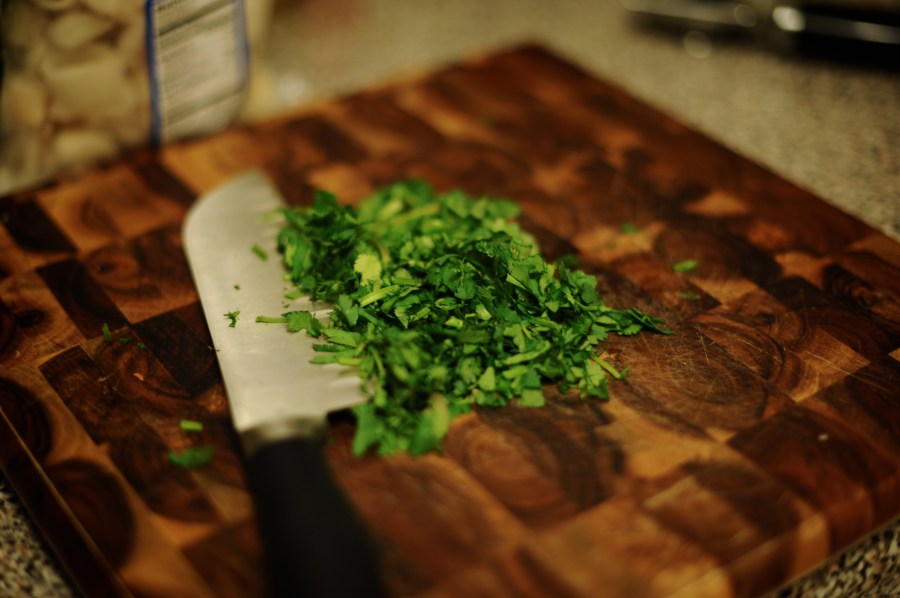 | I turned up the heat to high. Once the soup was boiling, I turned the fire down to medium and let it cook, covered, for 20 minutes. After the 20 minutes …. dinner was ready! I also chopped the cilantro to add it to the top of my portion (Leslie doesnt like it, but I love it!). | Puse todo a fuego alto. Una vez que la sopa comienzo a hervir, baje el fuego a medio y deje que todo se cociera junto, tapado por 20 minutos. Despues de 20 minutes…..la cena estaba lista! Tambien pique cilantro para ponerle a mi porcion (a Leslie no le gusta, pero a mi me encanta!) |