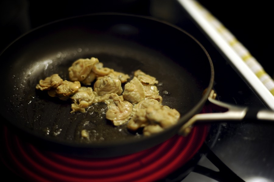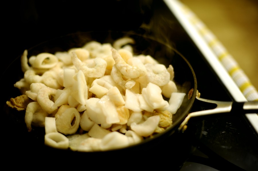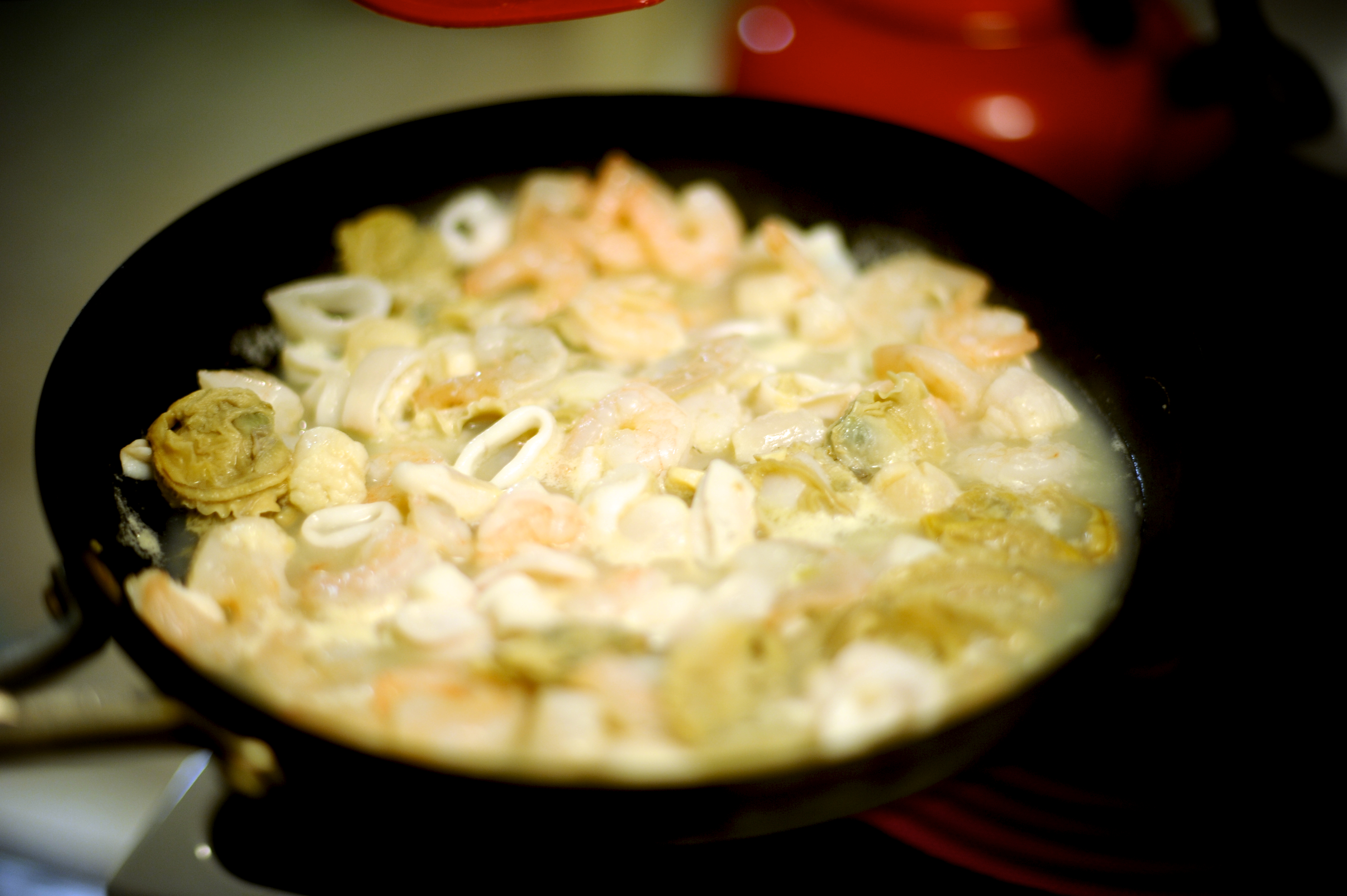 In a skillet I heated up a table spoon of olive oil. Once the skillet was hot, I added the clams and the seafood mix (after throwing away the water from the can of clams). The frozen seafood made a little soup in the skillet once it thawed out – I added it all to the big pot once the seafood was ready. |
