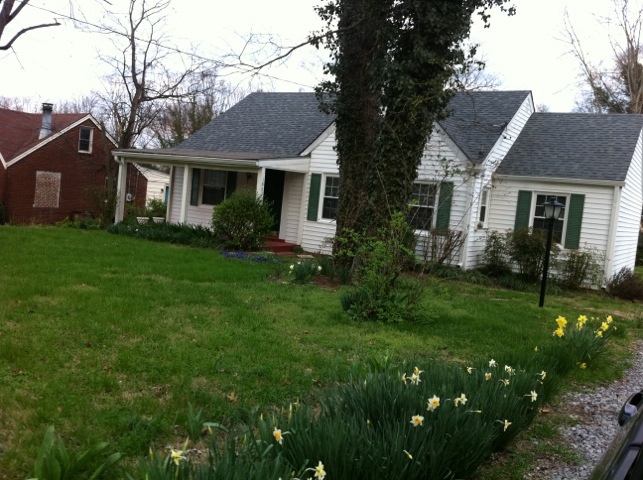 this was the house the first time we pulled up to it – the tree is now gone and so are the giant bushes. The buttercups are growing up right now. / Asi se veia la casa la primera vez que la visitamos