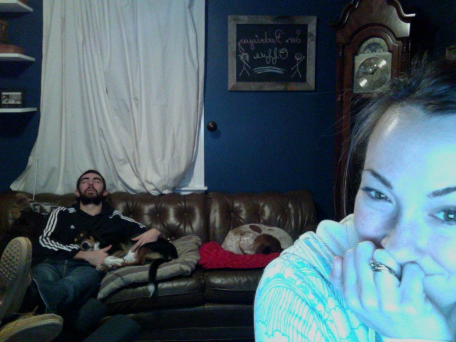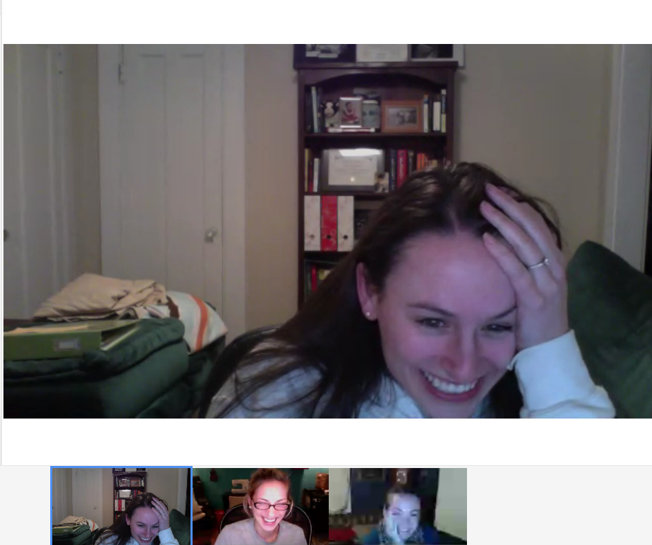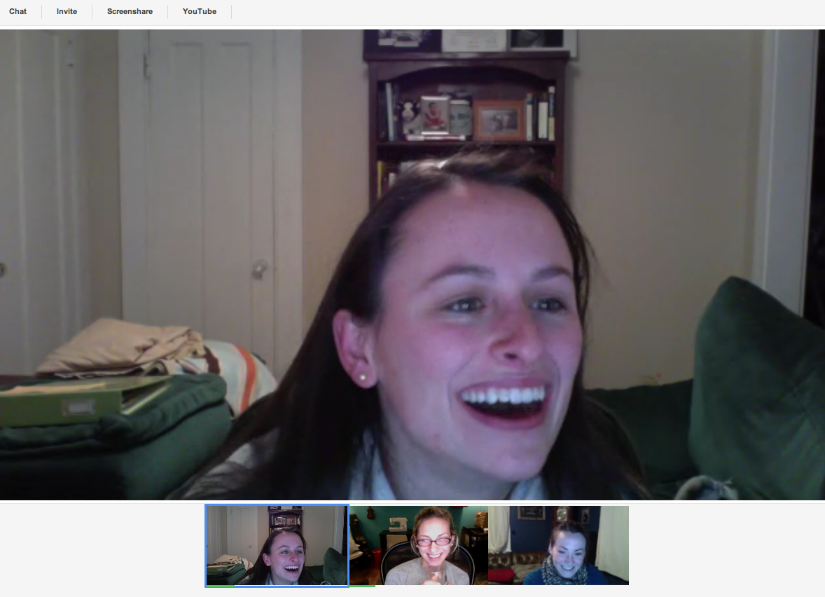 Wooow. Anyway, apparently our little happy hour infringed on the broomball playoffs, so hopefully next week we can find a different time to do the google+ hangout. Still, we all got to chat interweb face-to-face style and we had a blast. The connection and video quality were great (despite what the not-so-great photos below may show) so it felt like we were really with each other. I didn’t have the most wonderful day before our hangout but seeing and talking to these girls for the first time since Thanksgiving made up for everything else that was thrown at me earlier in the day. Here are some screen shots of our little session – and to be fair, I should add that most of the time they had no idea I was taking screen shots, and usually it was Dani who wound up in the main screen. |