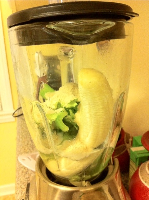 (The above mix was actually one of our few successes – bananas, celery, honey, spinach, some water and protein powder.)